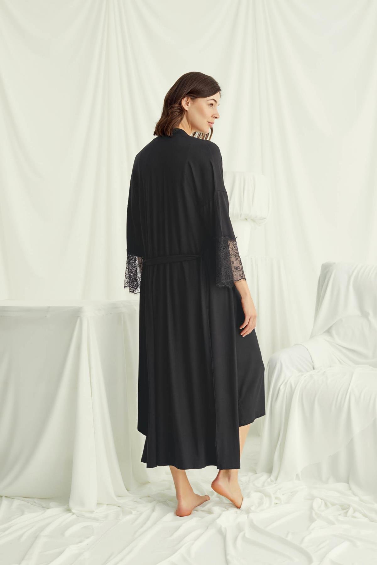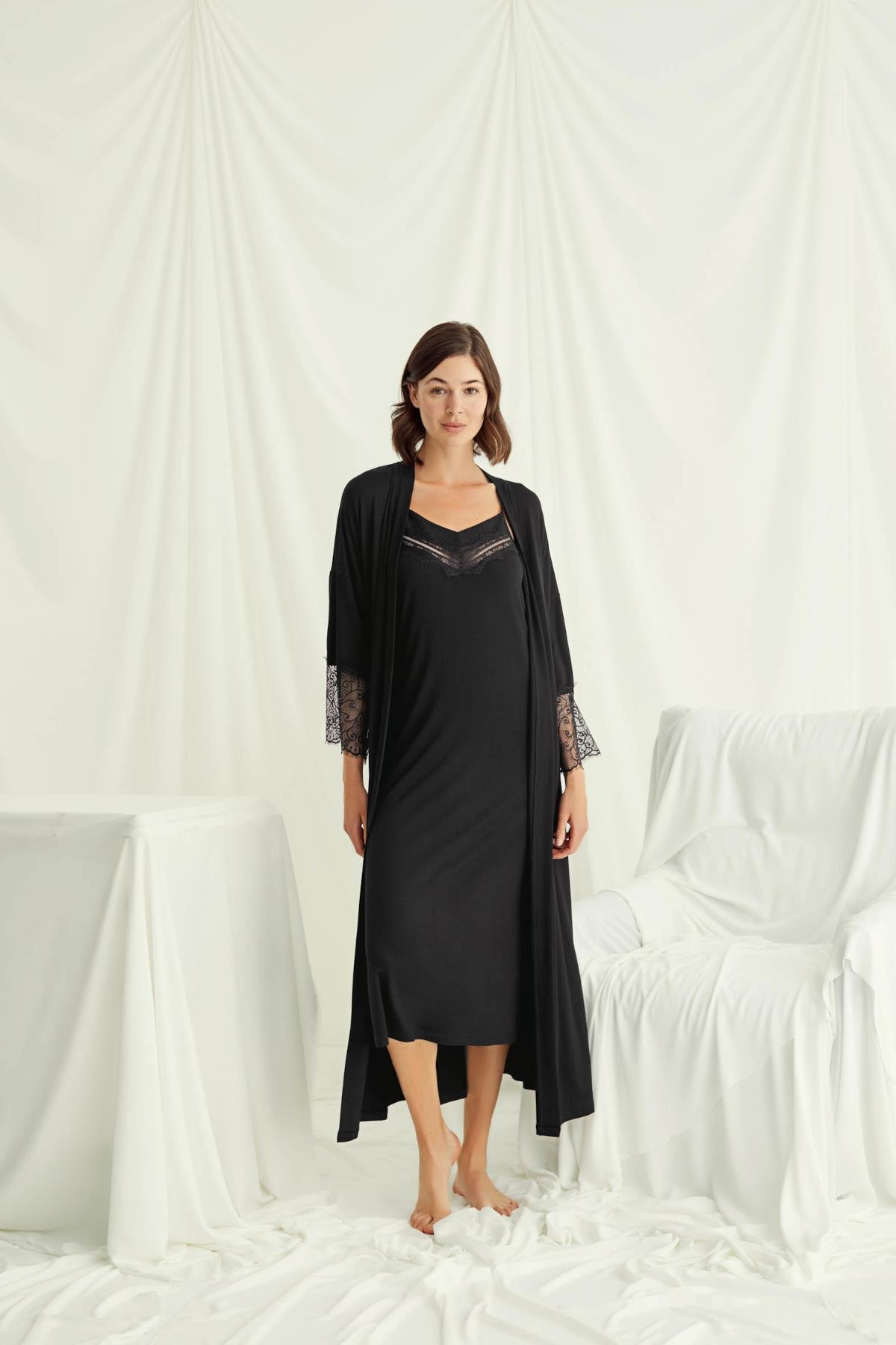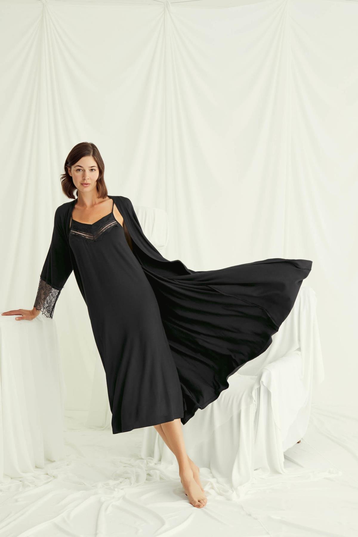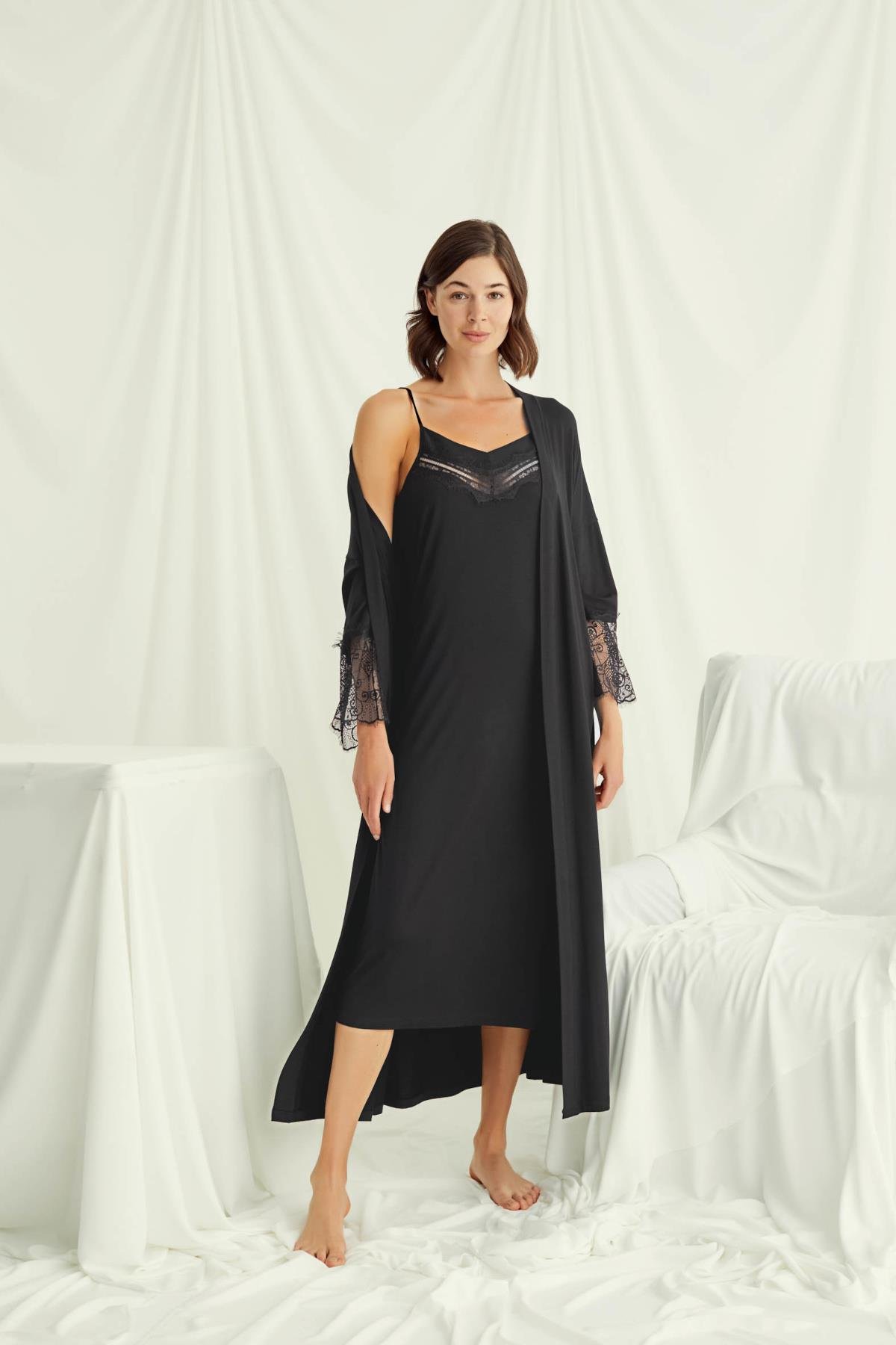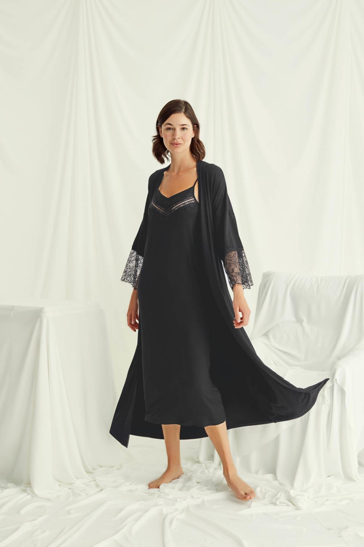 Sabahlık: Siyah renklidir, kolu dantellidir, uzun kolludur, kuşaklıdır, örme kumaştır. Gecelik: Siyah renklidir, ayarlanabilir ip askılıdır, derin V yaka dekoltelidir, göğüs kısmı dantellidir, örme kumaştır.