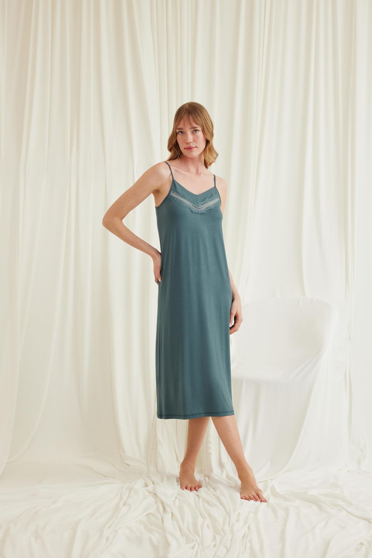 Sabahlık: Yeşil renklidir, kolu dantellidir, uzun kolludur, kuşaklıdır, örme kumaştır. Gecelik: Yeşil renklidir, ayarlanabilir ip askılıdır, derin V yaka dekoltelidir, göğüs kısmı dantellidir, örme kumaştır.