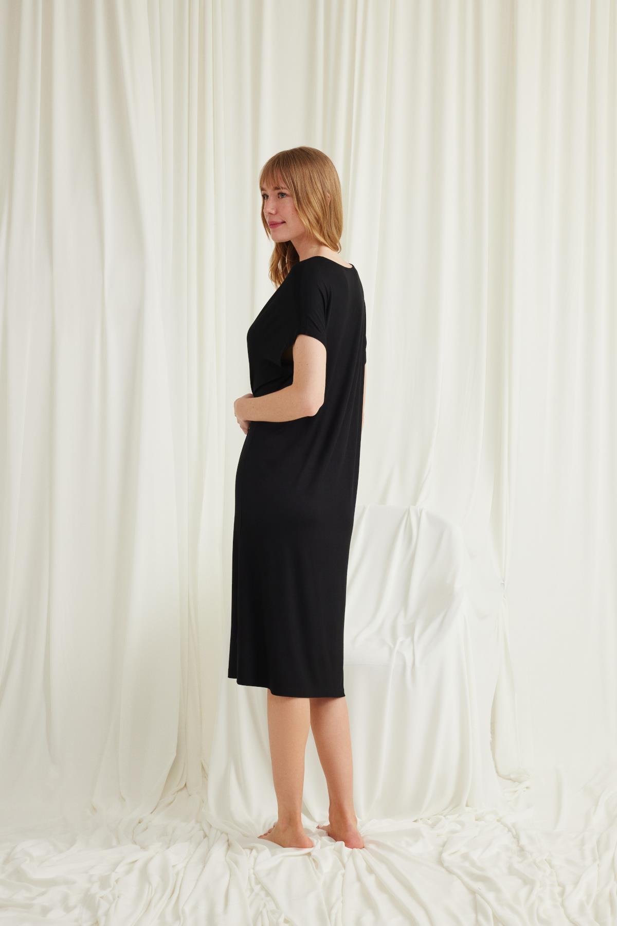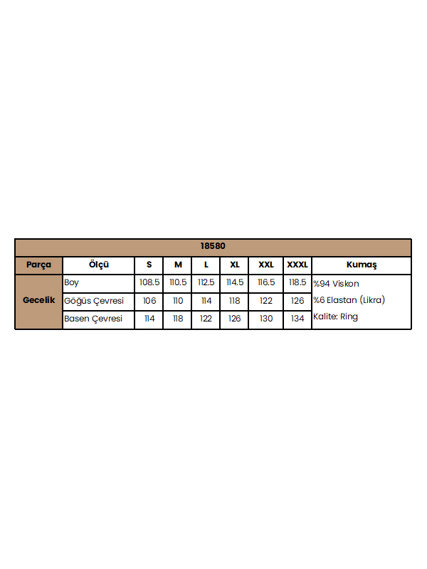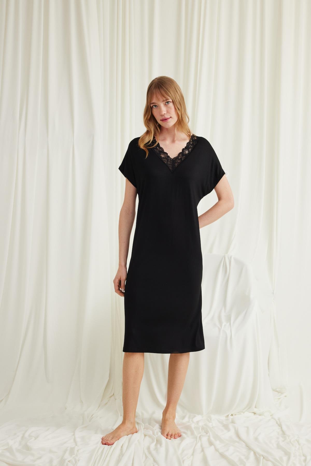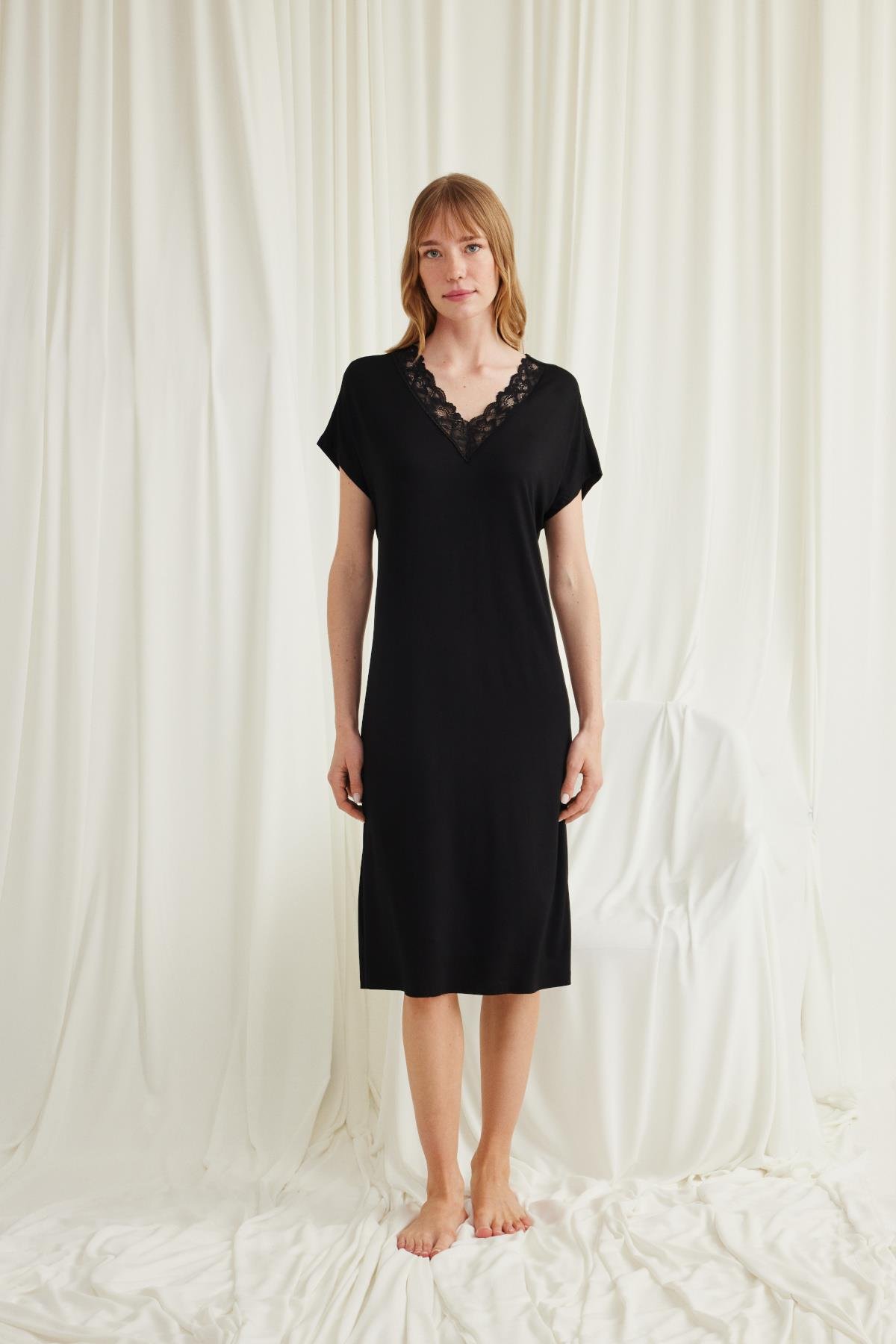 Gecelik: V yakalıdır, kısa kolludur, yakası dantellidir, siyah renklidir, örme kumaştır.