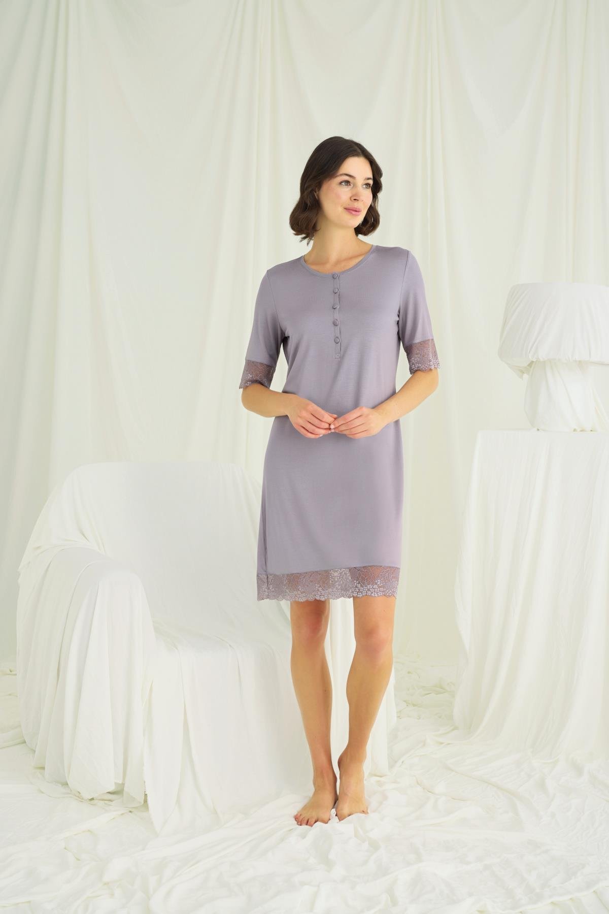 Gecelik: Bisiklet yakalıdır, kısa kolludur, önü düğmelidir, kol ağzı ve etek kısmı dantellidir, gri renklidir, örme kumaştır.