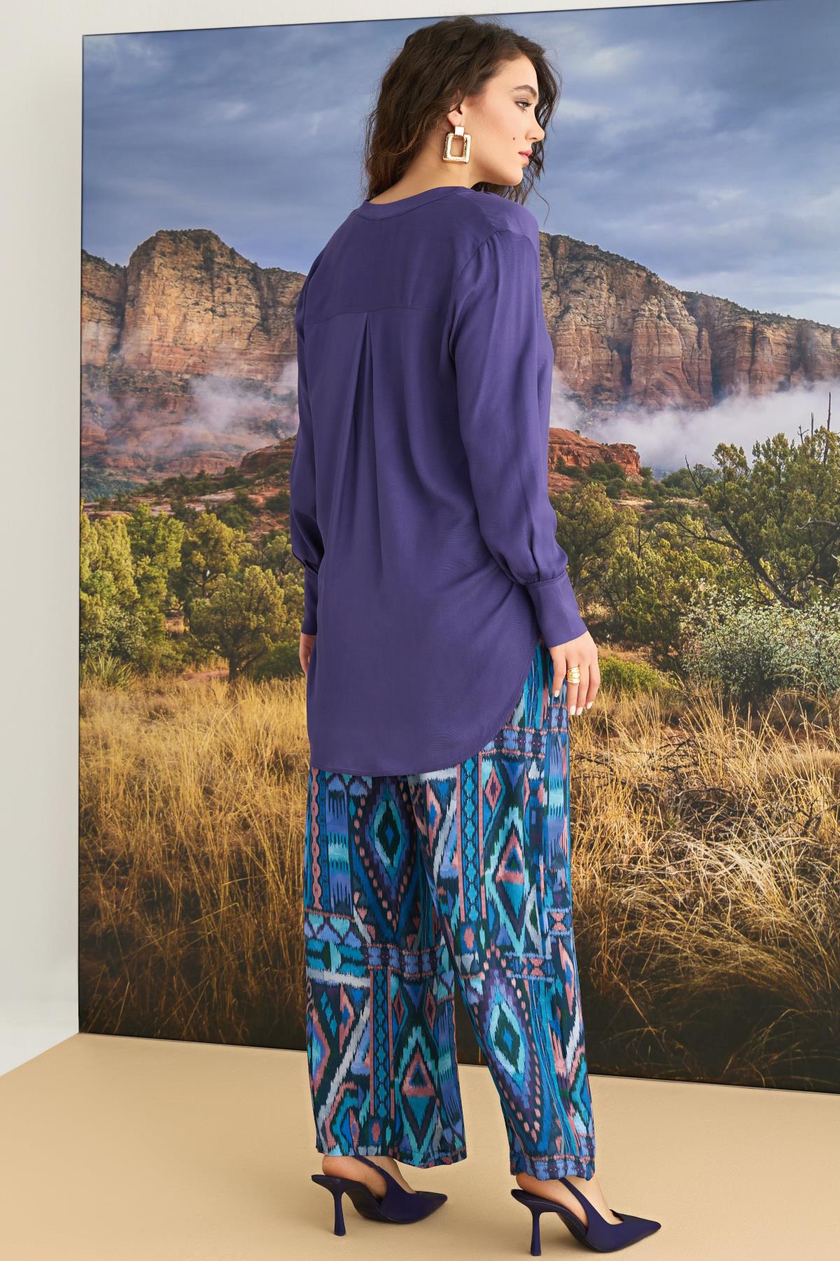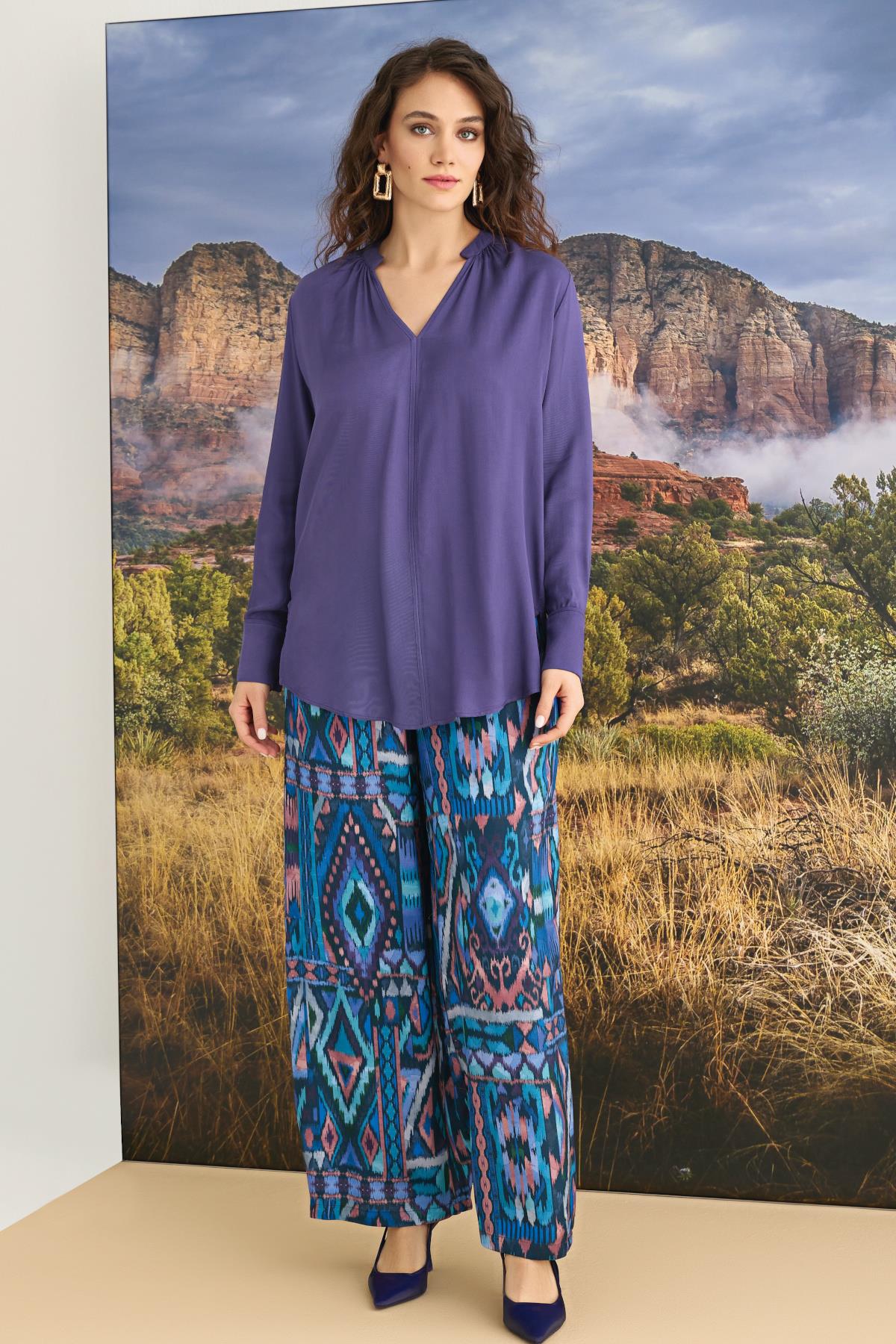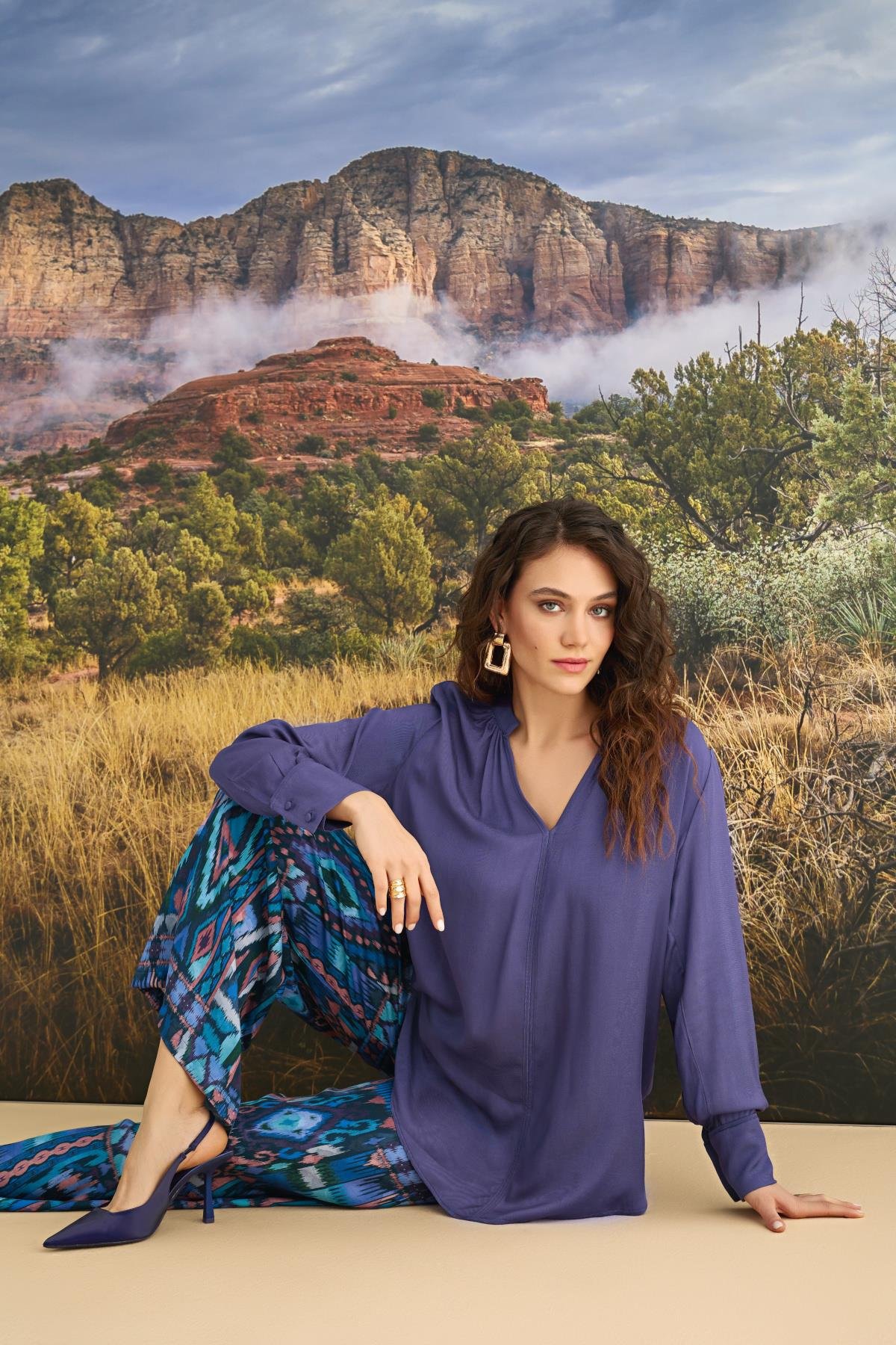 Üst: V yakalıdır, mor renklidir, dokuma kumaştır.Alt: Etnik desenlidir, dokuma kumaştır