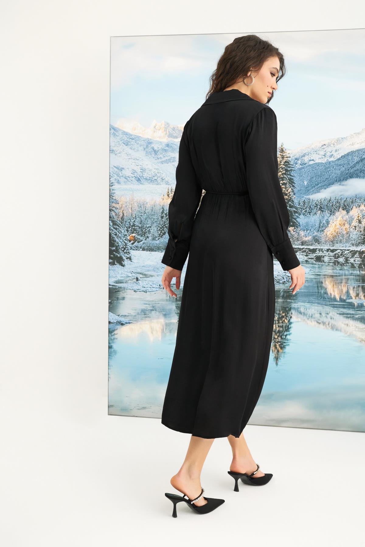 Elbise: Siyah renklidir, derin V yakalıdır, uzun kolludur, dokuma kumaştır.