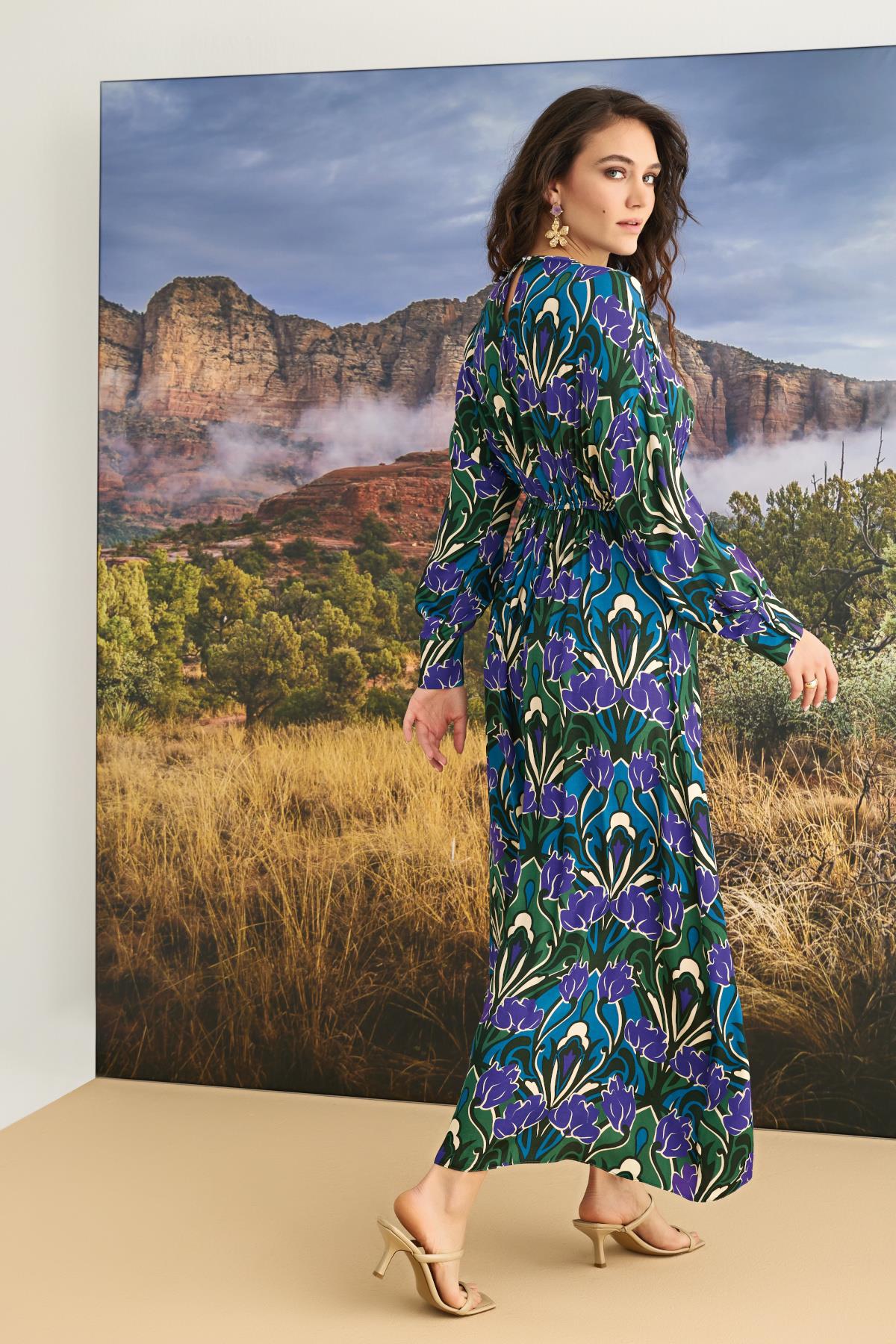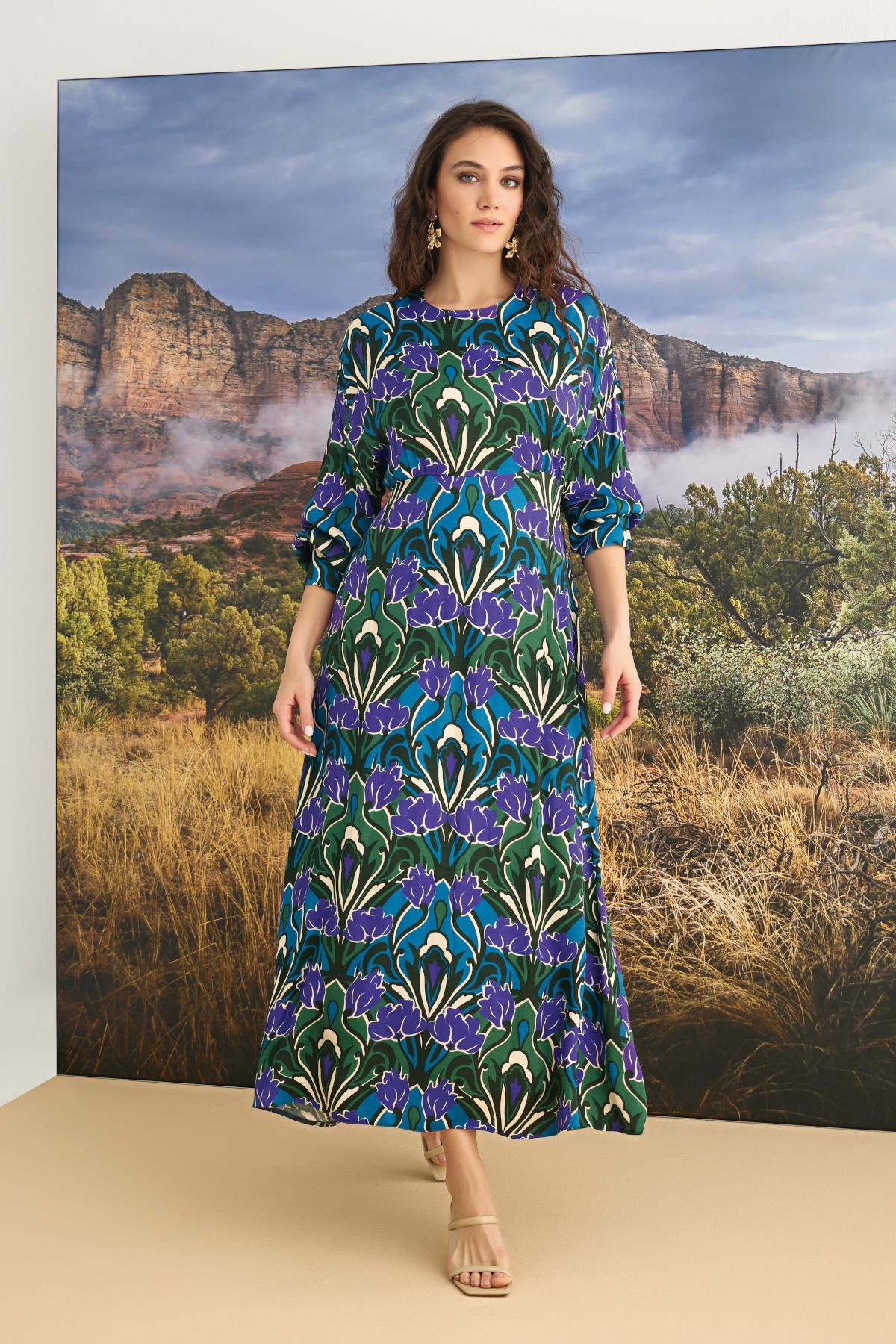 Elbise: Yaprak desenlidir, bisiklet yakalıdır, truvakar kolludur, dokuma kumaştır.