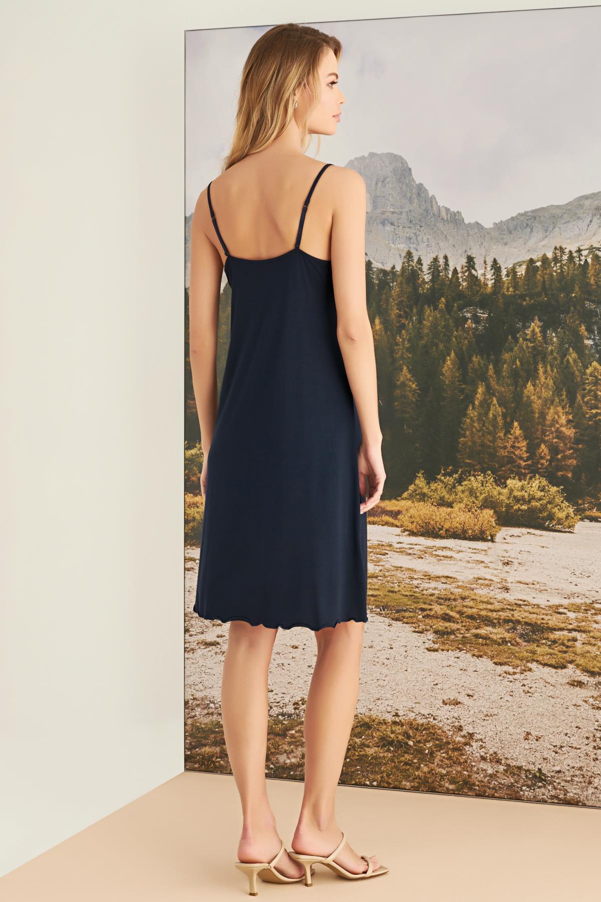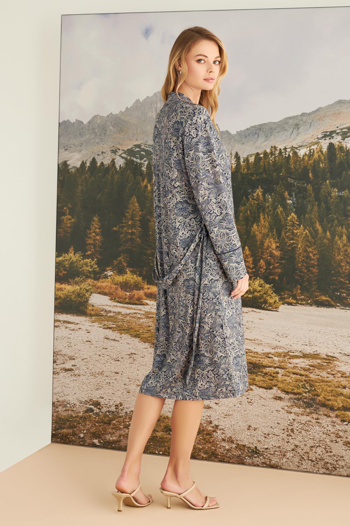 Sabahlık: Lacivert zemin üzerine yaprak desenlidir, kuşaklıdır, örme kumaştır.Gecelik: Lacivert renklidir, derin V yaka dekoltelidir, ayarlanabilir ip askılıdır, yırtmaçlıdır, yakası ve yırtmaç kısmı brode dantellidir, örme kumaştır.