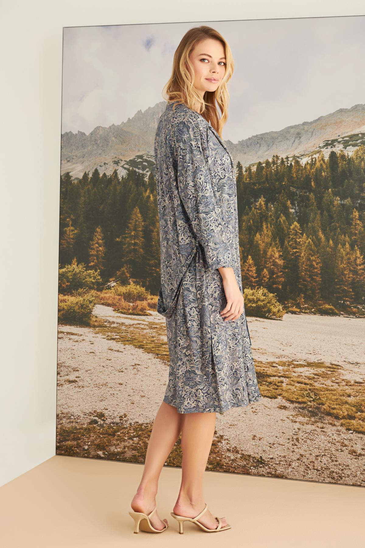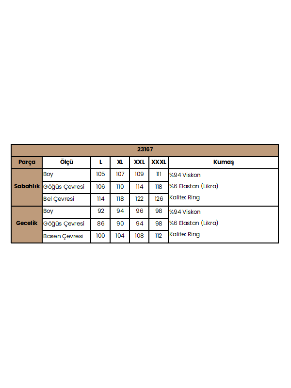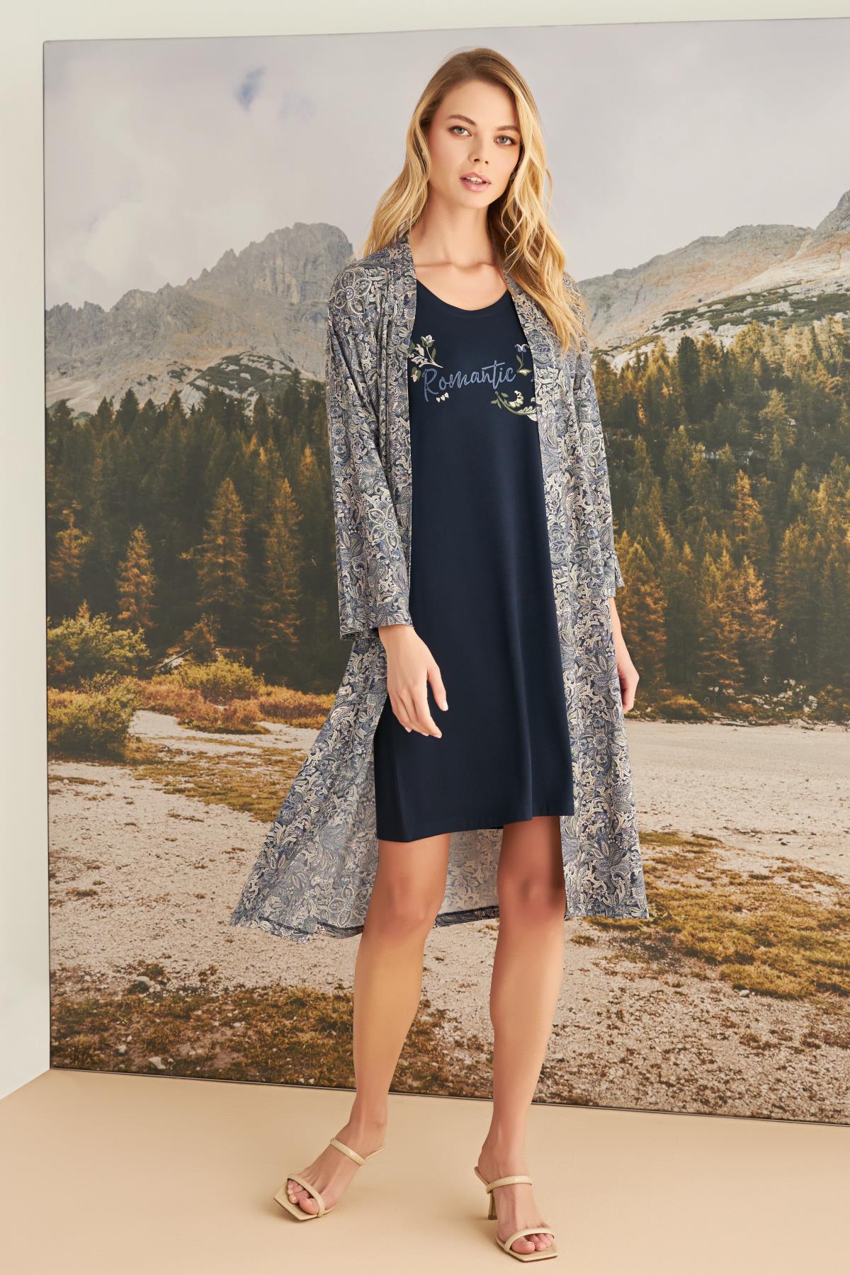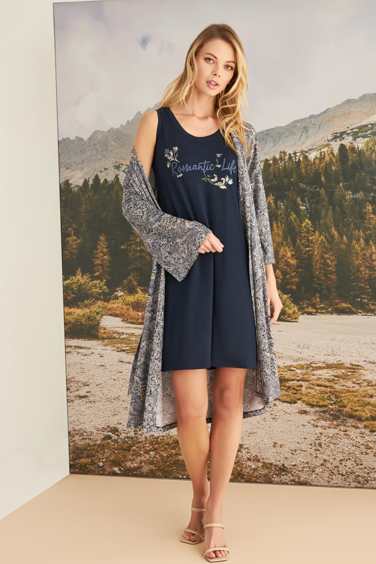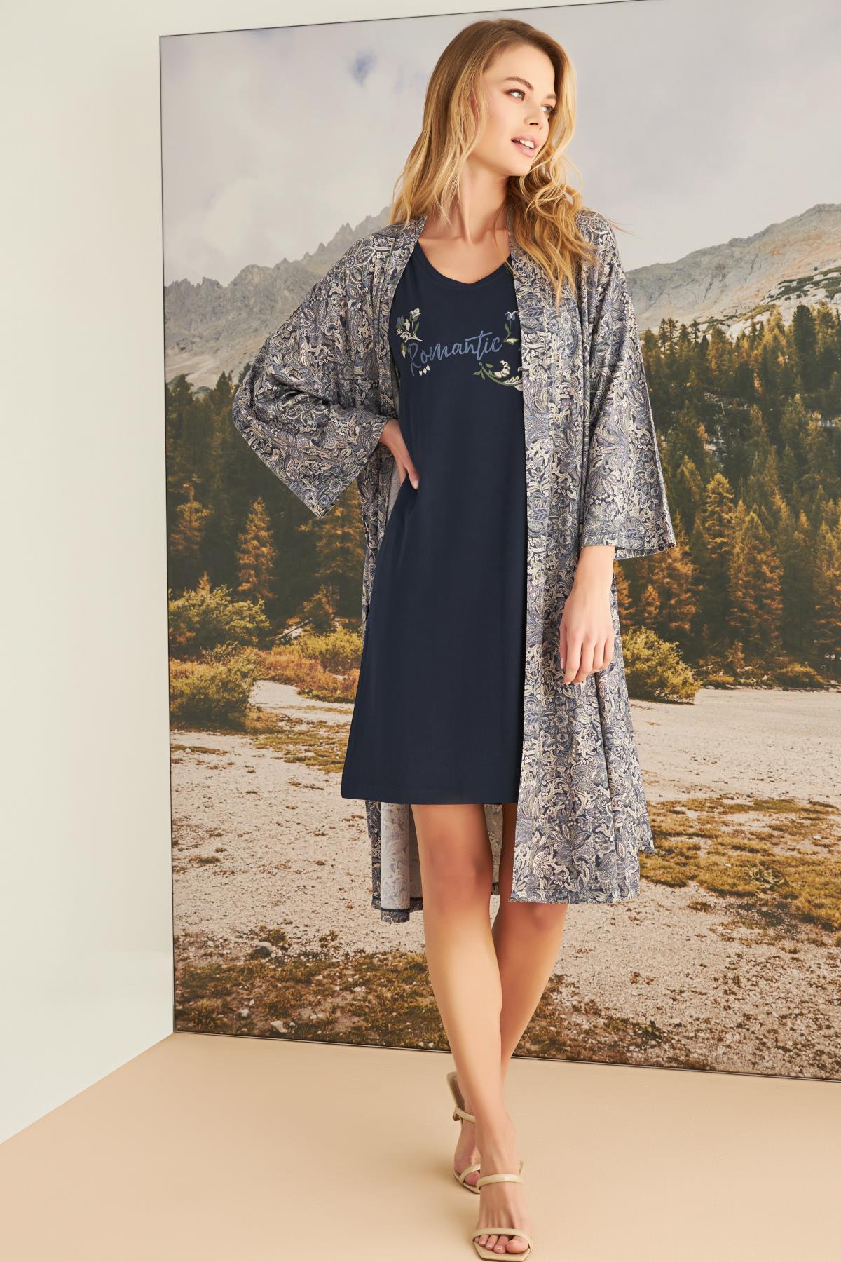 Sabahlık: Uzun kolludur, yaprak desenlidir, kuşaklıdır, örme kumaştır.Gecelik: Lacivert renklidir, bisiklet yakalıdır, kalın askılıdır, çiçek ve yaprak baskılıdır, +Romantic Life+ yazılıdır, örme kumaştır.
