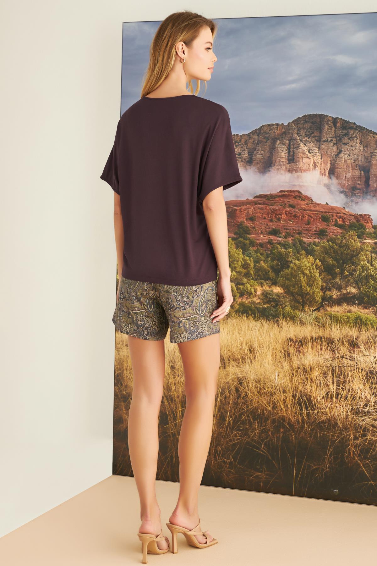 Üst: Mürdüm renklidir, V yakalıdır, kısa kolludur, yakası dantellidir, örme kumaştır.Alt: Etnik desenlidir, ceplidir, örme kumaştır.