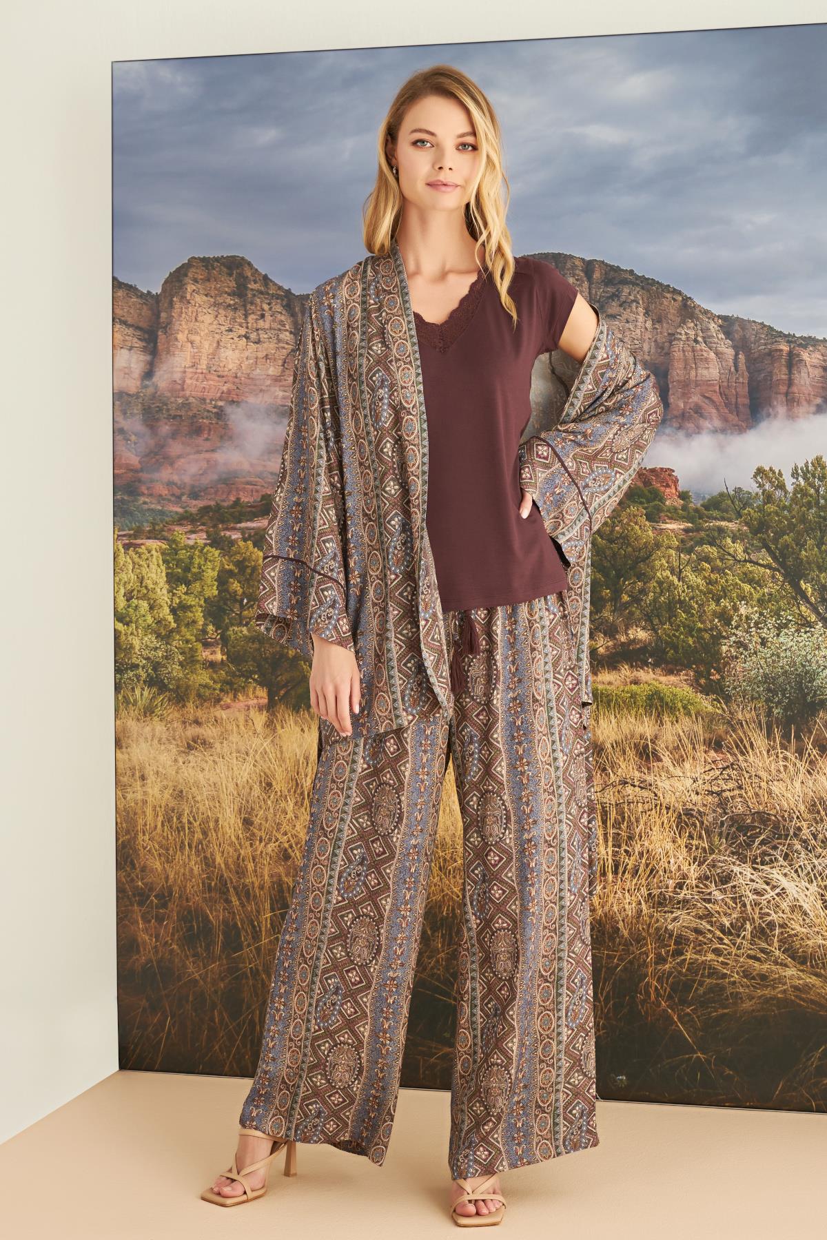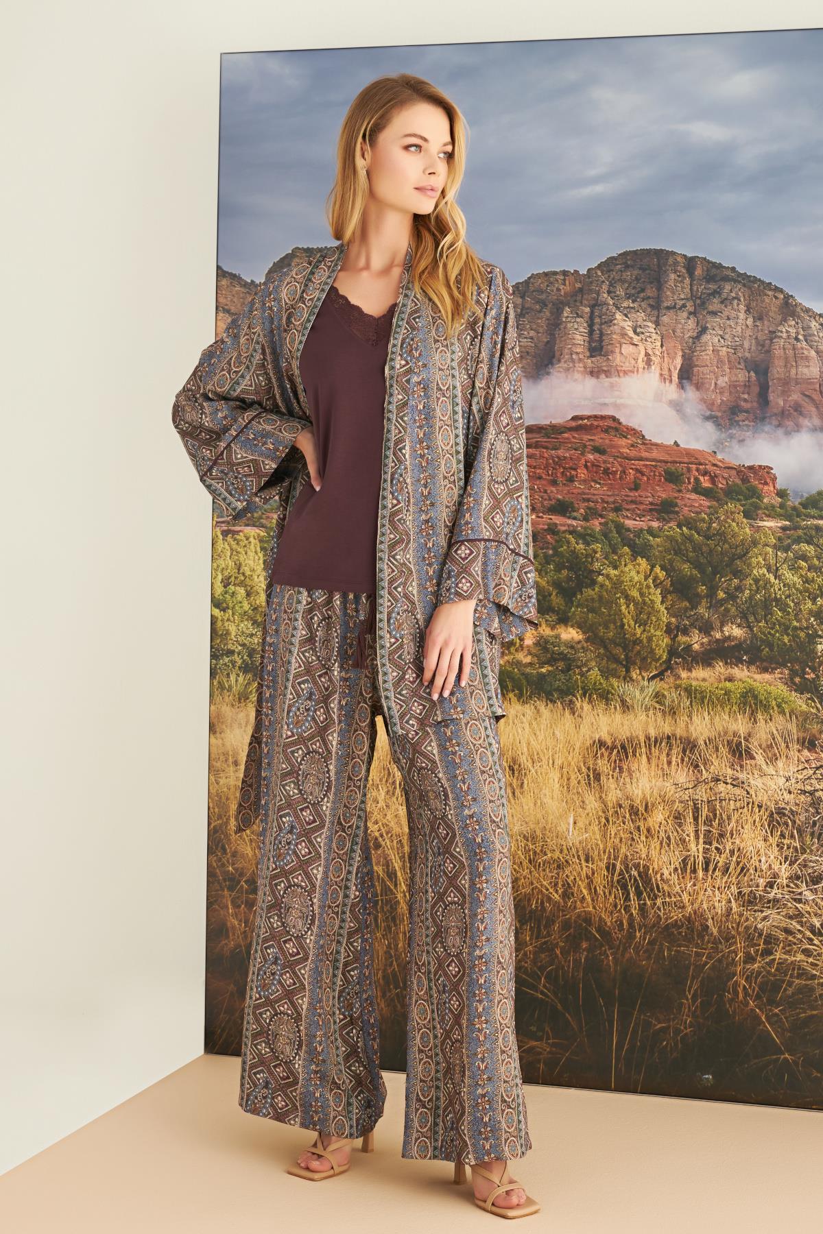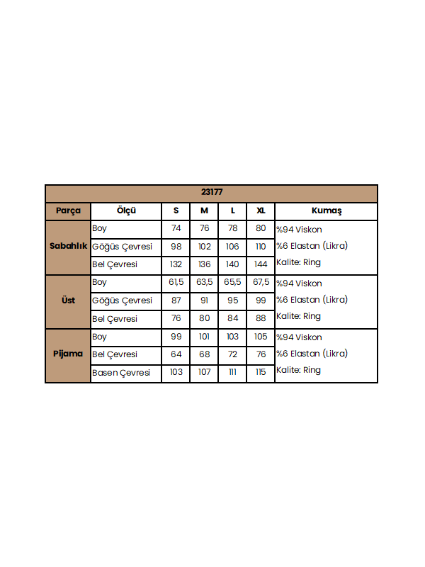 Sabahlık: Etnik desenlidir, uzun kolludur, kuşaklıdır, örme kumaştırÜst: Mürdüm renklidir, V yakalıdır, kısa kolludur, yakası dantellidir, örme kumaştır.Alt: Etnik desenlidir, önden bağcık püskül detaylıdır, örme kumaştır.