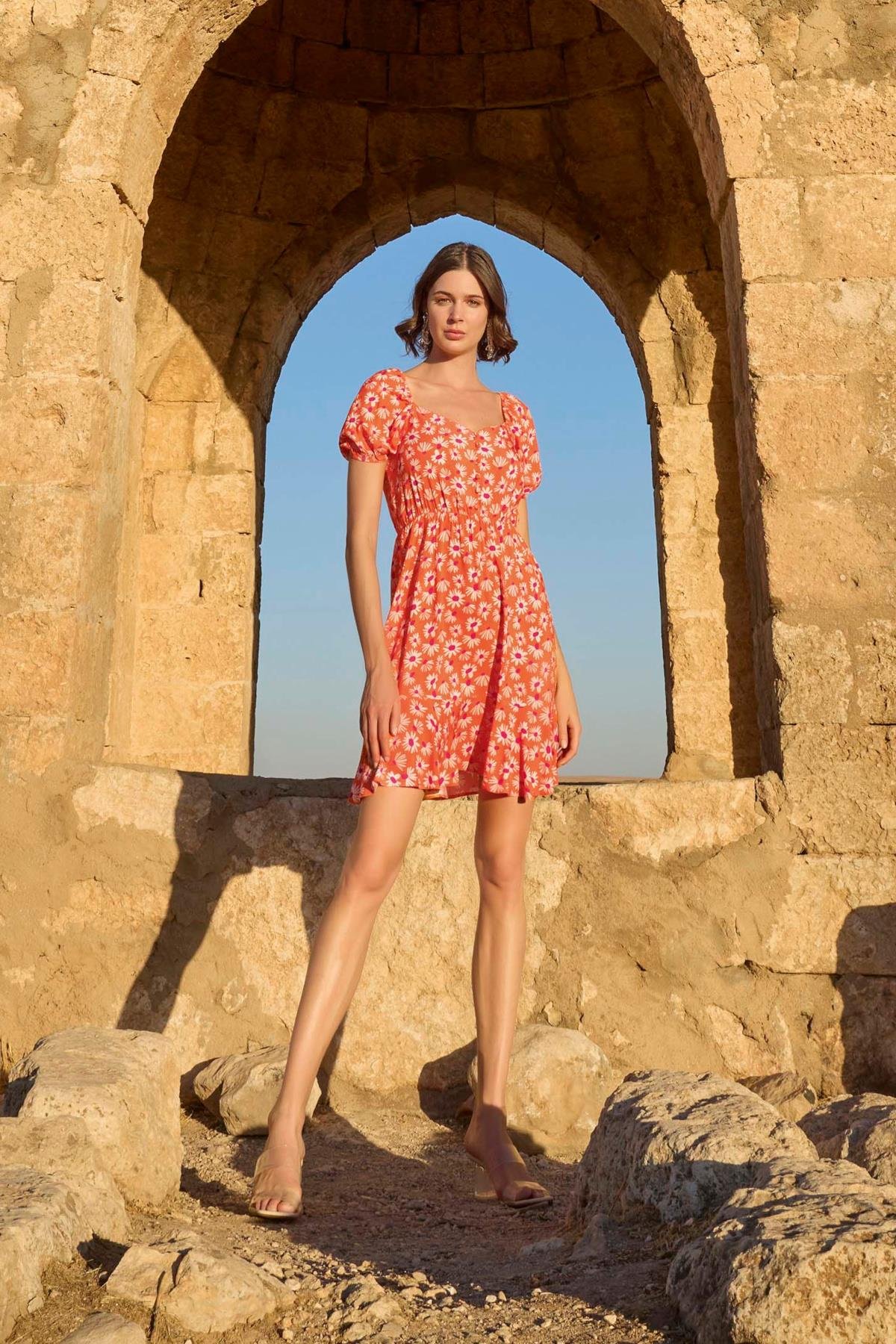 Elbise: Turuncu zemin üzerine çiçek desenlidir, derin V yakalıdır, kısa kolludur, kol ağzı lastiklidir, dokuma kumaştır.