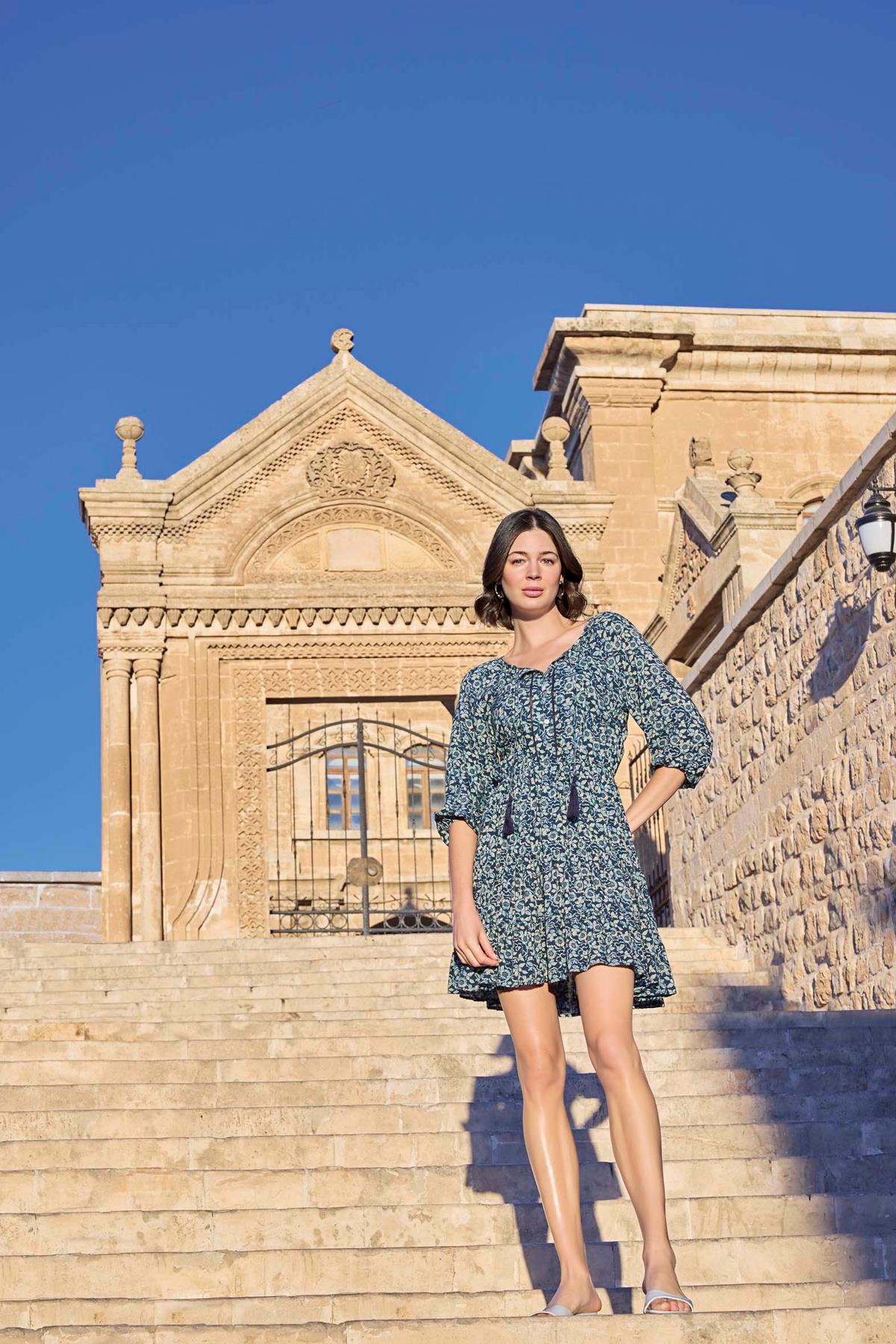 Elbise: Lacivert zemin üzerine çiçek desenlidir, V yakalıdır, truvakar kolludur, dokuma kumaştır.