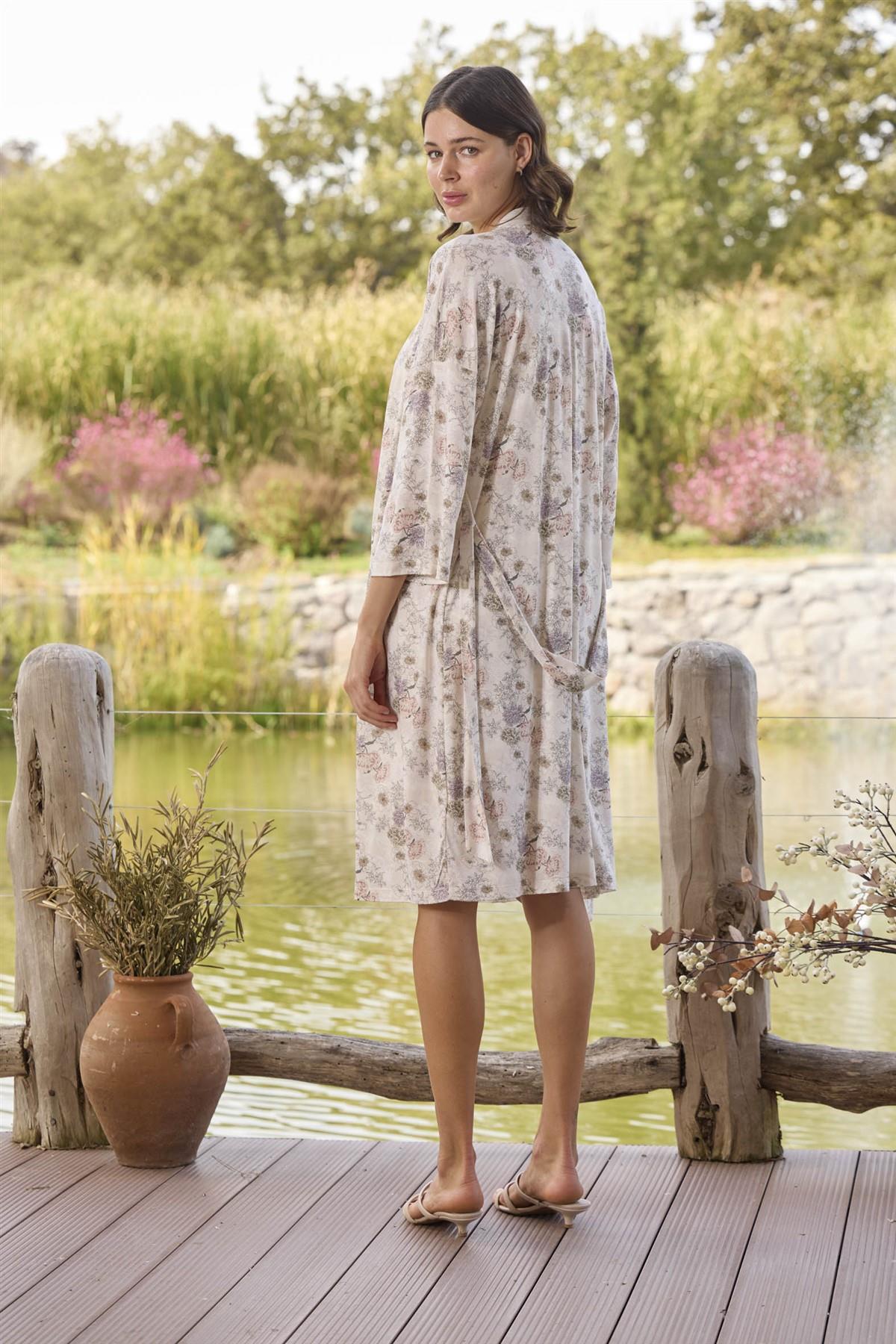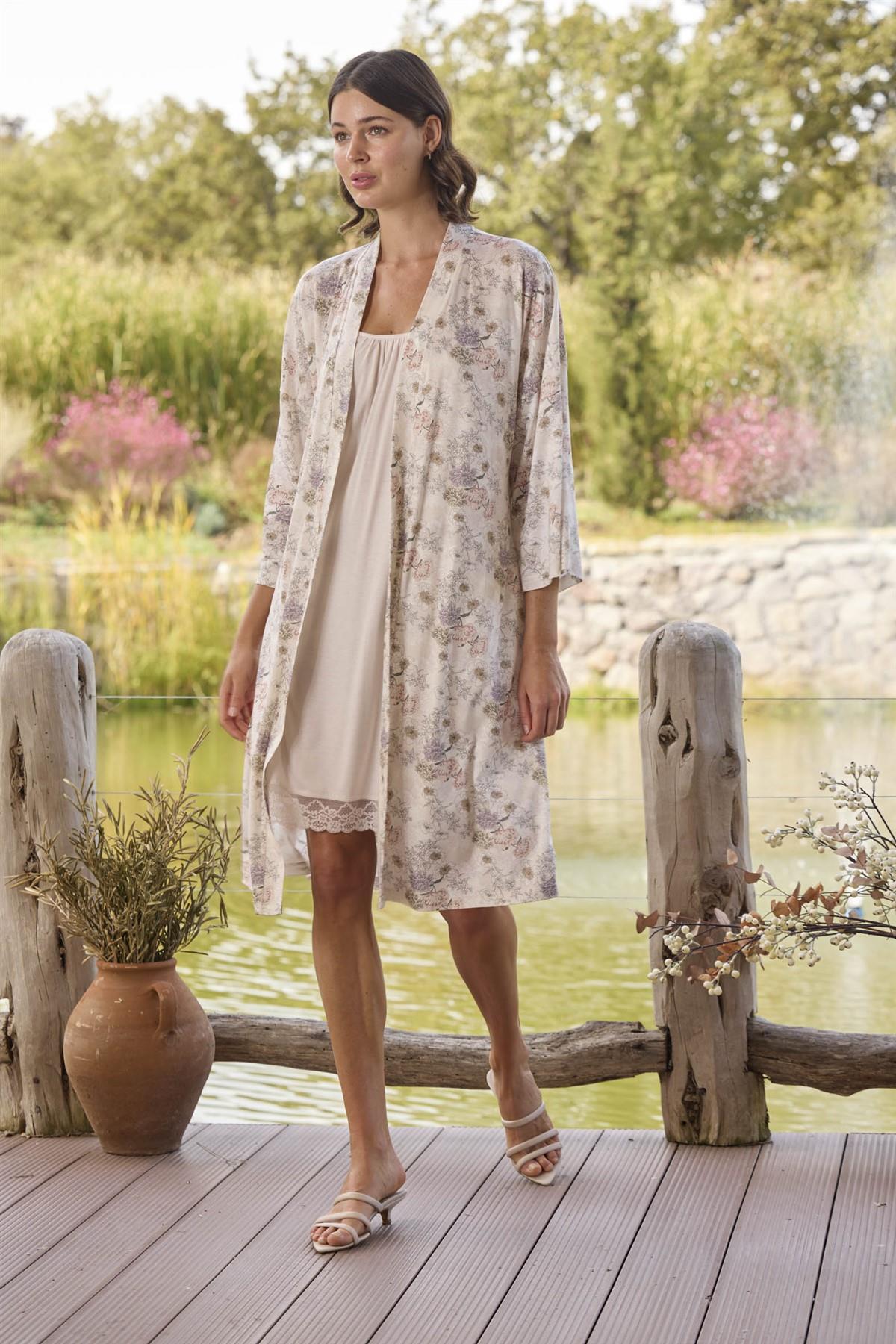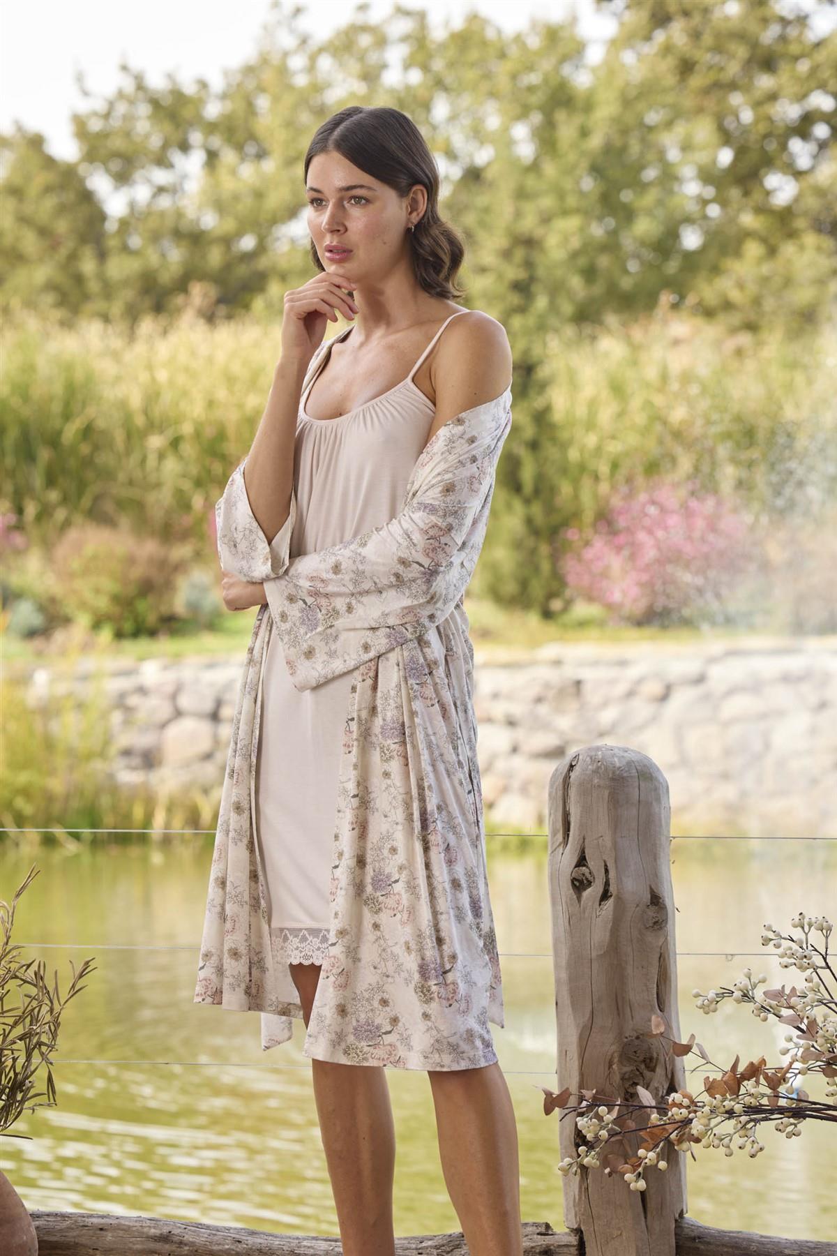 Sabahlık: Pembe zemin üzerine çiçek desenlidir, 3/4 kolludur, kuşaklıdır, örme kumaştır. Gecelik: Pembe renklidir, derin V yakalıdır, dekoltelidir, etek ağzı dantellidir, lastik askılıdır, örme kumaştır.