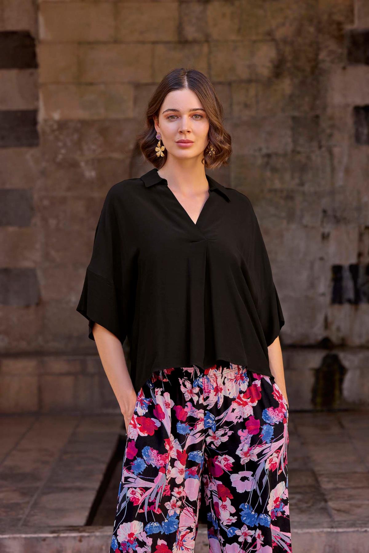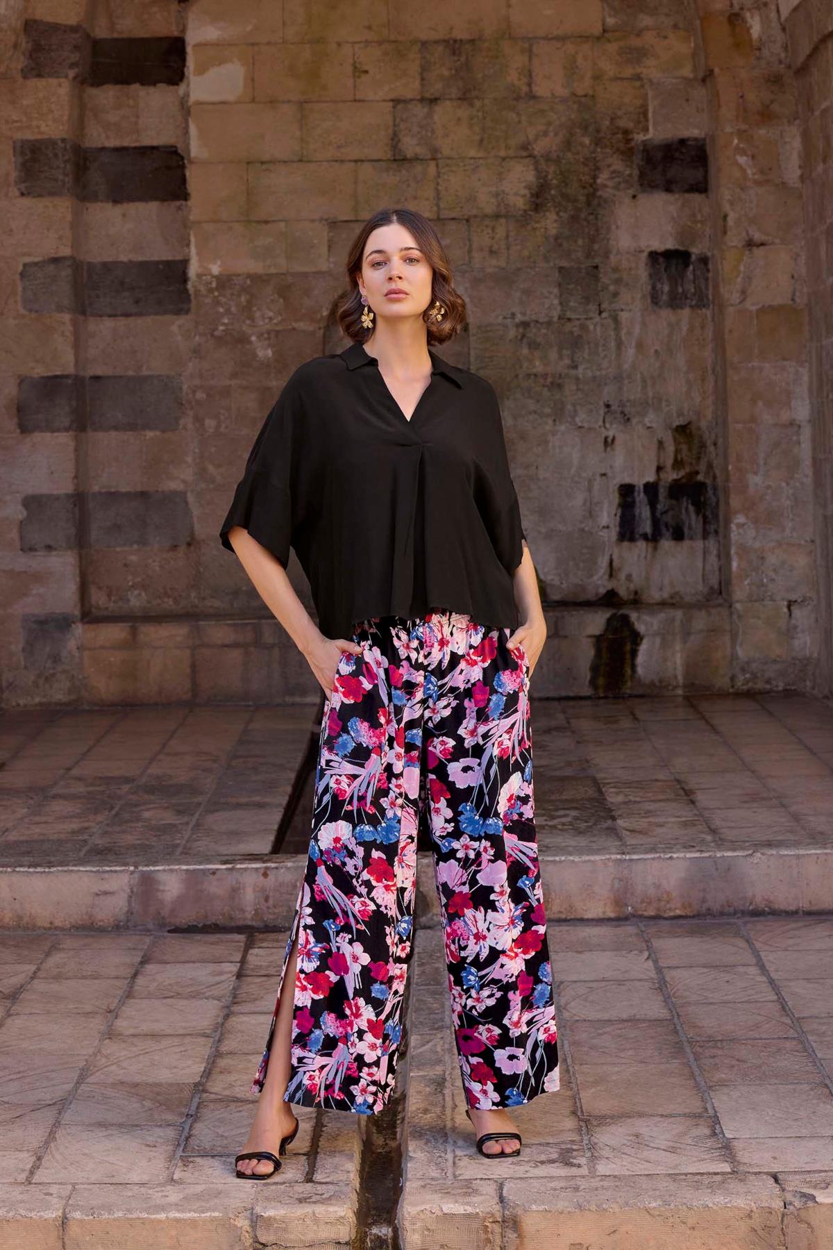 Üst: Siyah renklidir, V yakalıdır, kısa kolludur, dokuma kumaştır. Alt: Siyah zemin üzerine çiçek desenlidir, ceplidir, yırtmaçlıdır, dokuma kumaştır.