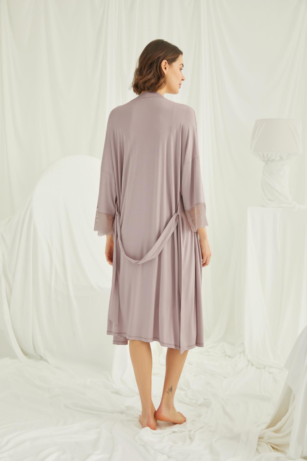 Sabahlık: Vizon renklidir, uzun kolludur, kuşaklıdır, kol ucu dantellidir, örme kumaştır. Gecelik: Vizon renklidir, derin V yakalıdır, yakası, göğsü ve göğüs altı dantellidir, emzirme için askılardan açılır durumdadır, ayarlanabilir lastik askılıdır, örme kumaştır.