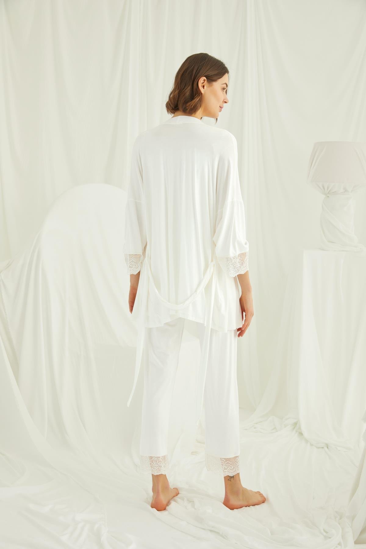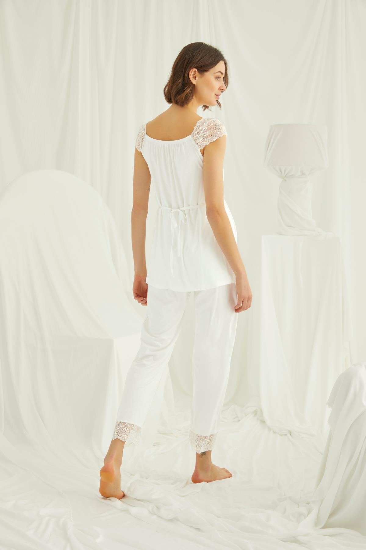 Sabahlık: Ekru renklidir, uzun kolludur, kuşaklıdır, kol ucu dantellidir, örme kumaştır. Üst: Ekru renklidir, kare yakalıdır, kısa kolludur, kolu, omzu ve yakası dantellidir, yakasının altı düğmelidir, emzirme için düğmelerden açılır durumdadır, örme kumaştır. Alt: Ekru renklidir, paçası dantellidir, beli ayarlanabilir lastiklidir, örme kumaştır.