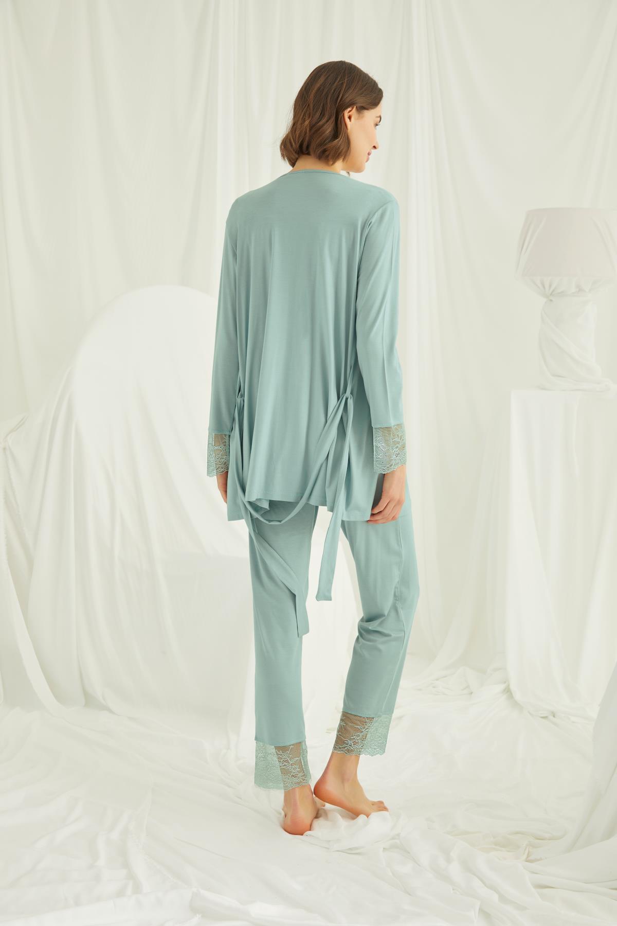 Sabahlık: Açık yeşil renklidir, uzun kolludur, kuşaklıdır, kol ucu dantellidir, örme kumaştır. Üst: Açık yeşil renklidir, kare yakalıdır, kısa kolludur, kolu, omzu ve yakası dantellidir, yakasının altı düğmelidir, emzirme için düğmelerden açılır durumdadır, örme kumaştır. Alt: Açık yeşil renklidir, paçası dantellidir, beli ayarlanabilir lastiklidir, örme kumaştır.