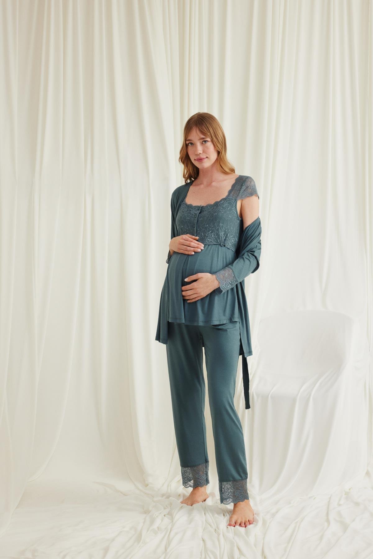 Sabahlık: Yeşil renklidir, uzun kolludur, kolu dantellidir, kuşaklıdır, örme kumaştır. Üst: Yeşil renklidir, kare yakalıdır, kısa kolludur, kolu, omzu ve göğsü dantellidir, emzirme için düğmelerden açılır durumdadır, örme kumaştır. Alt: Yeşil renklidir, paçası dantellidir, beli ayarlanabilir lastiklidir, örme kumaştır.