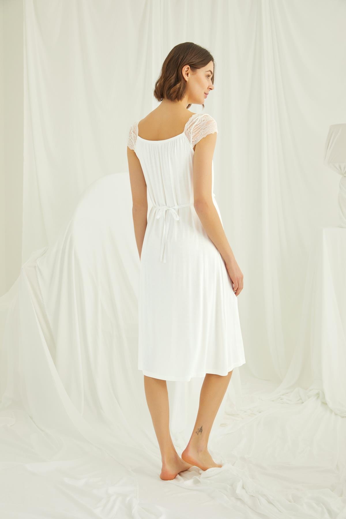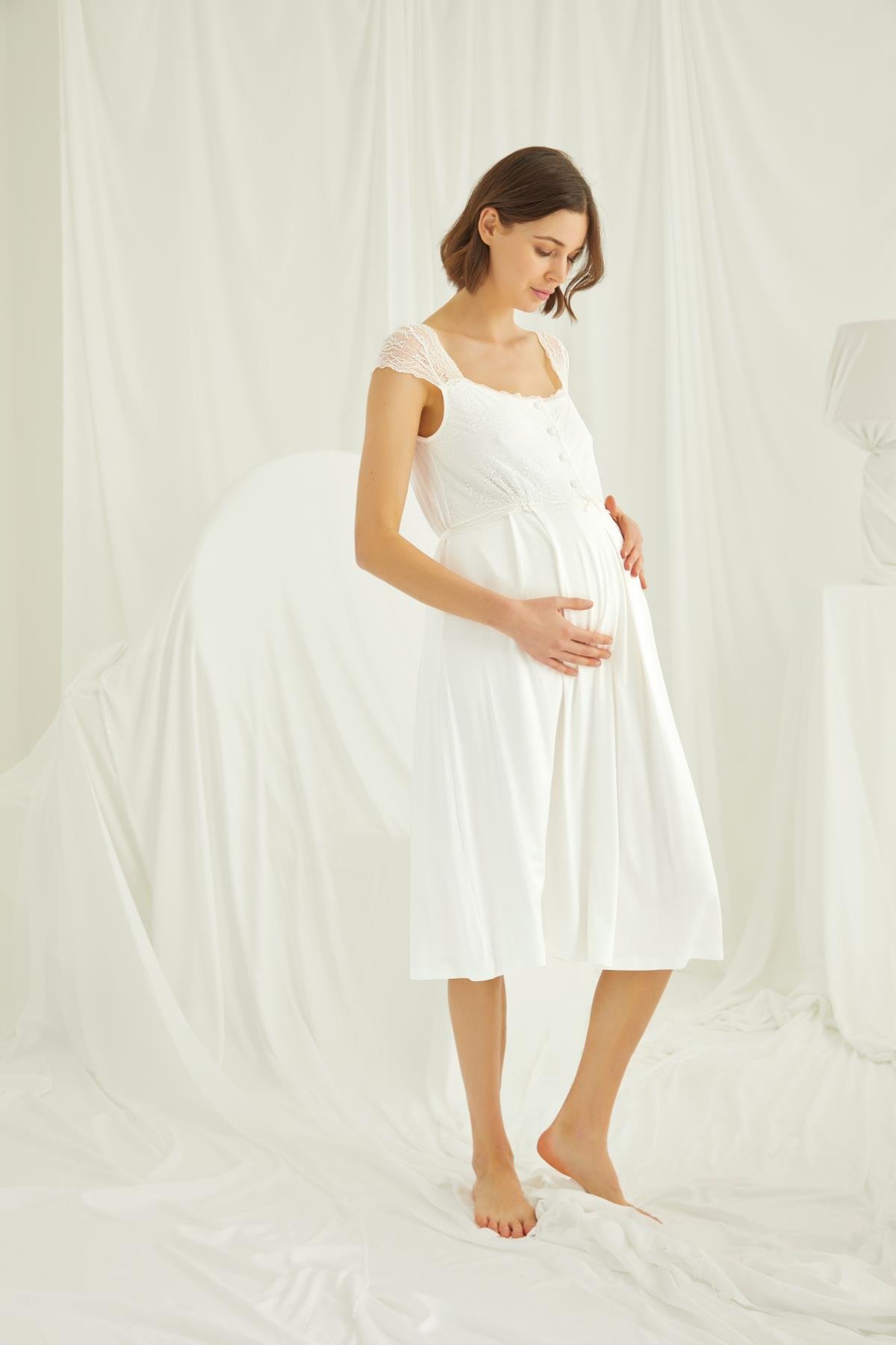 Gecelik: Kare yakalıdır, kısa kolludur, kolu, omzu ve göğüs kısmı dantellidir, yakasının altı düğmelidir, emzirme için düğmelerden açılır durumdadır, ekru renklidir, örme kumaştır.