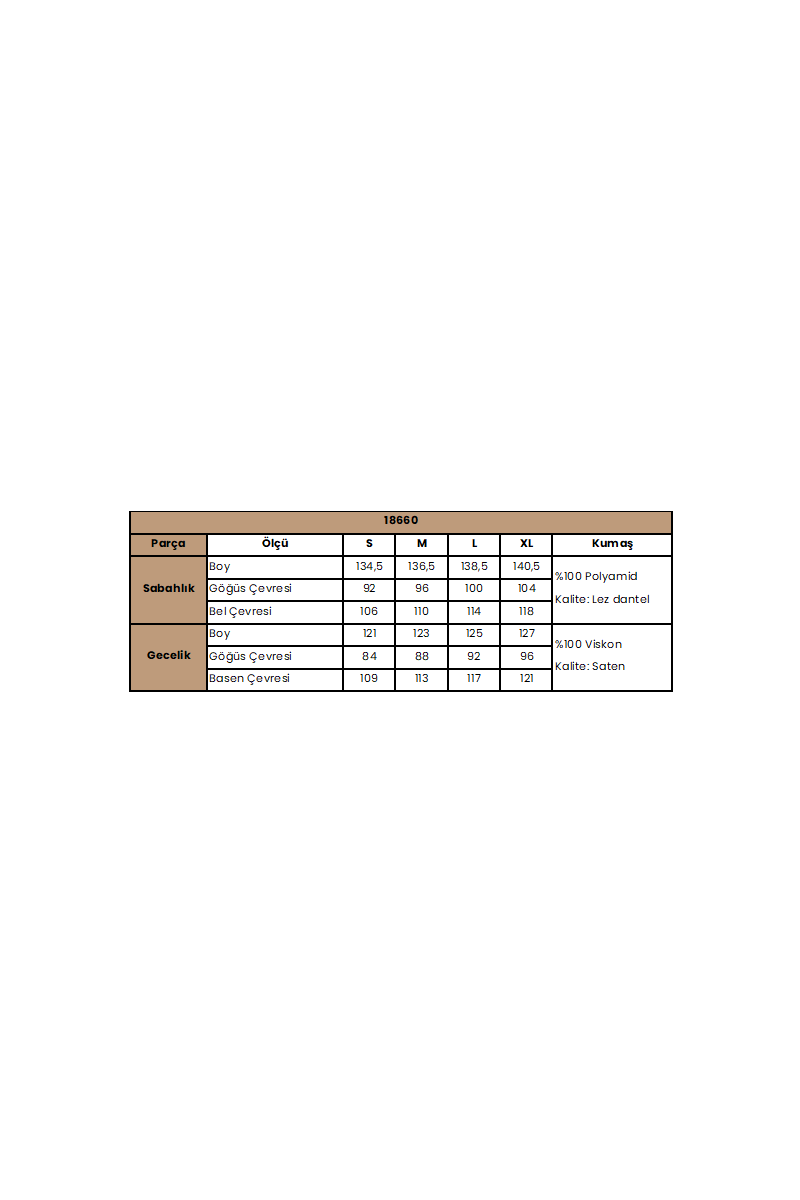 Sabahlık: Dantellidir, beyaz renklidir, uzun kolludur, kuşaklıdır. Gecelik: Beyaz renklidir, derin V yakalıdır, sırt ve göğüs dekoltelidir, yakası dantellidir, kalın askılıdır, dokuma kumaştır.