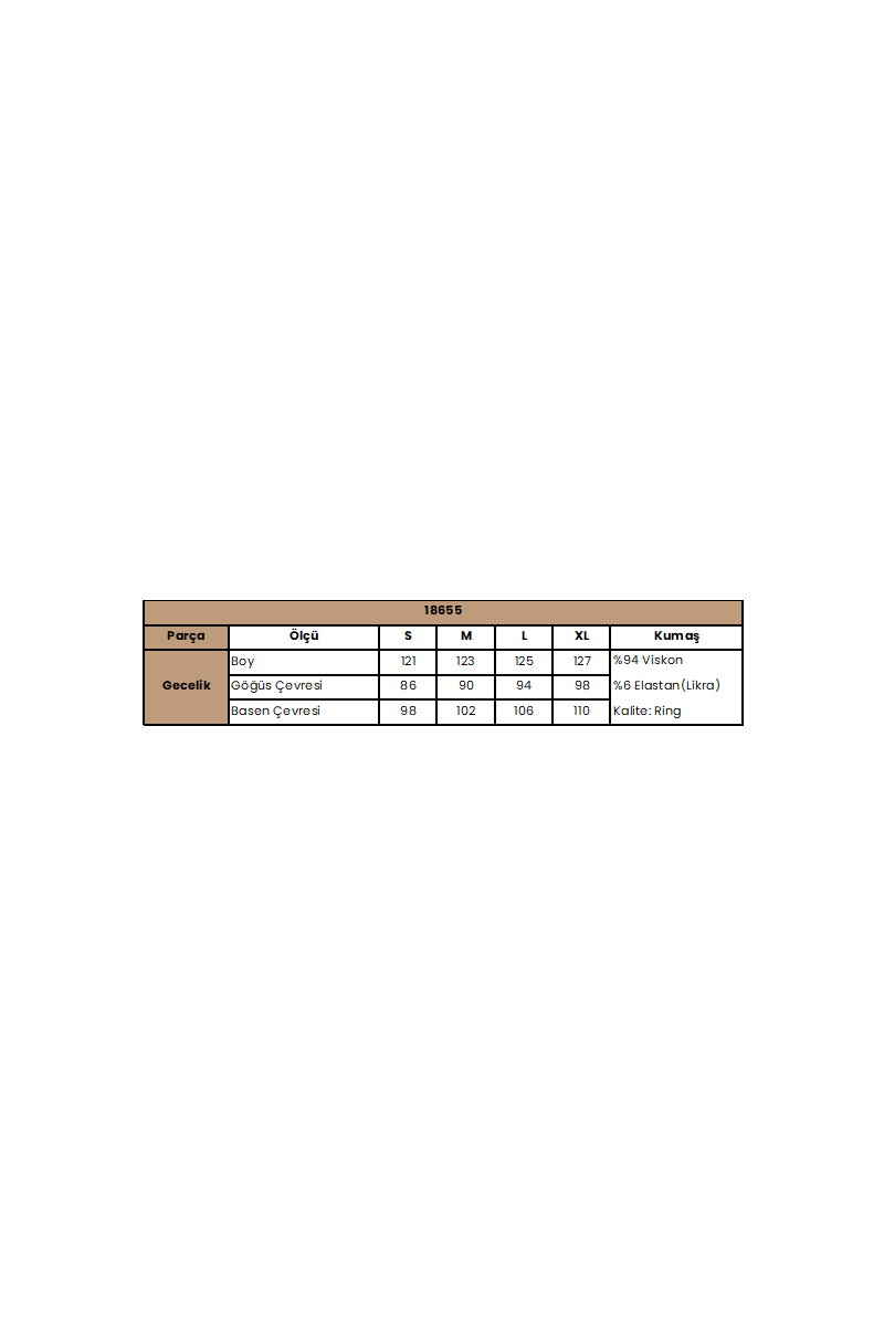 Gecelik: Beyaz renklidir, derin V Yakalıdır, göğüs ve sırt dekoltelidir, ip askılıdır, yakası, göğüs ve askı kenarları dantellidir, yırtmaçlıdır, örme kumaştır.