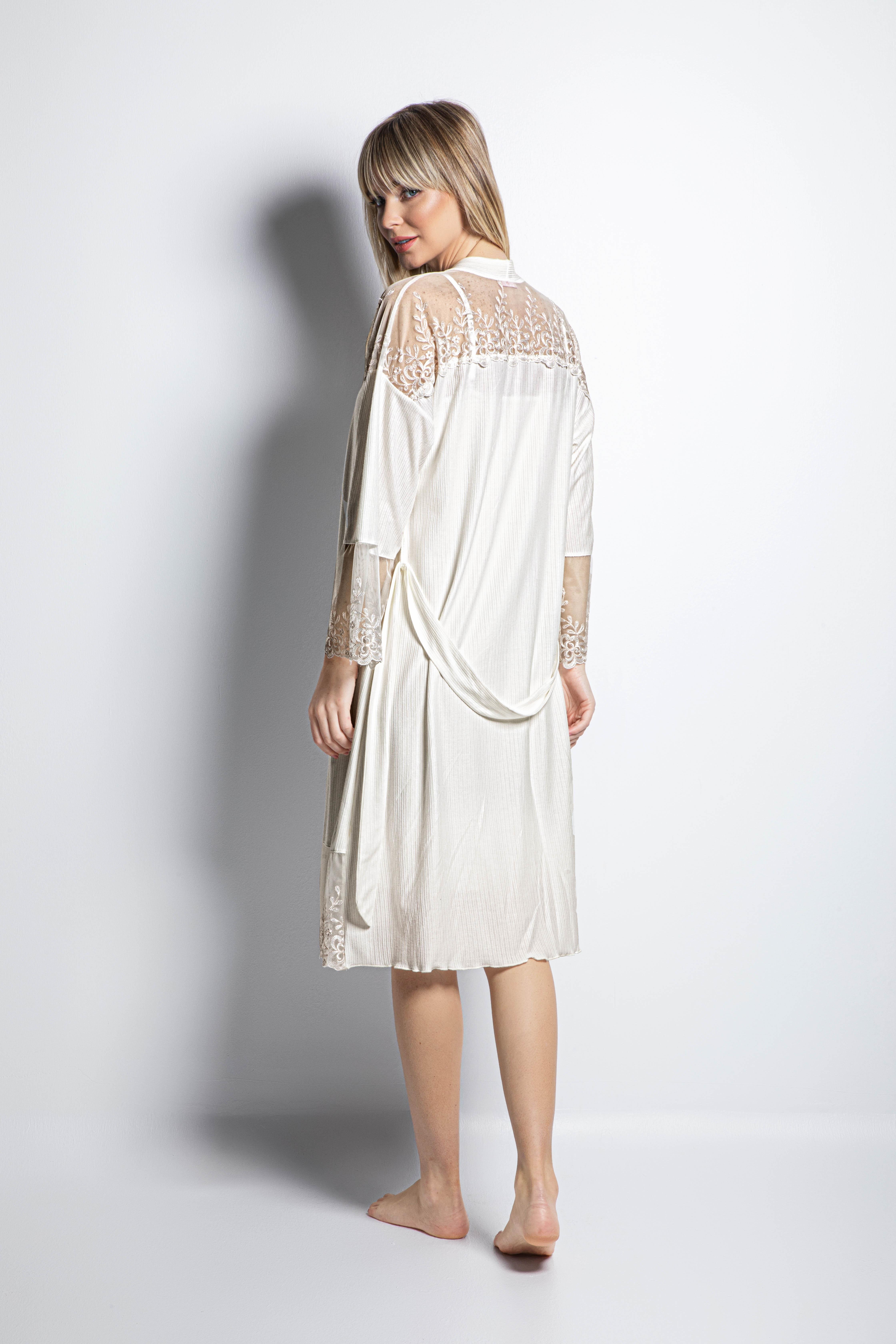 Sabahlık: Uzun kolludur, ekru renklidir, kol, sırt, omuz ve etek kısımları brode dantellidir, örme kumaştır. Gecelik: Ayarlanabilir lastik askılıdır, derin V yaka dekoltelidir, ekru renklidir, göğüs ve göğüs altı brode dantellidir, örme kumaştır.