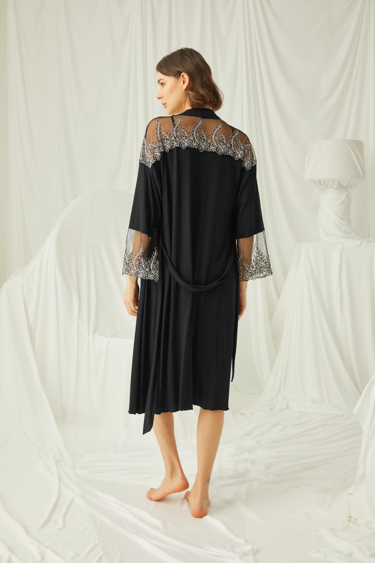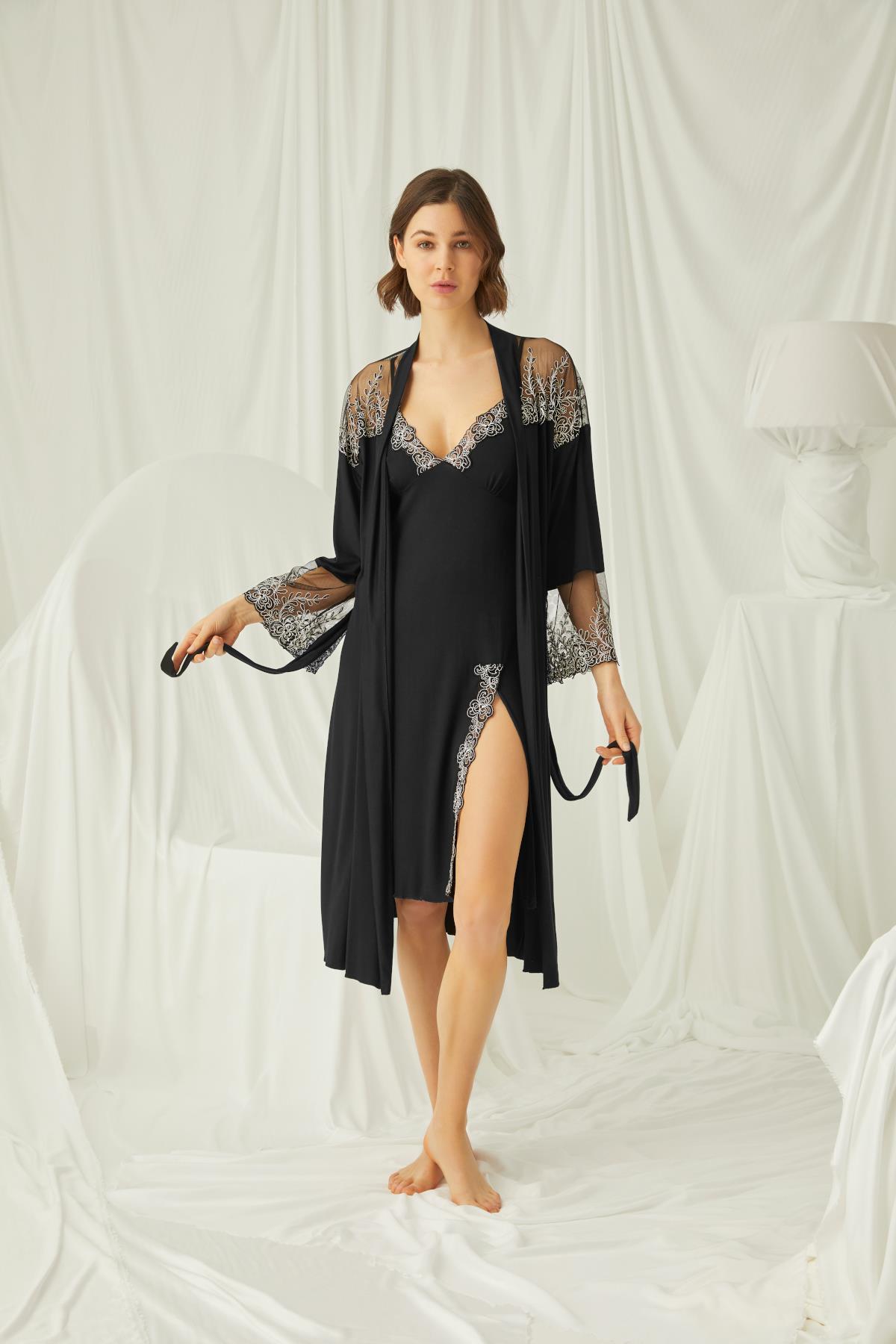 Sabahlık: Siyah renklidir, kol ve omuz bölgesi brode dantellidir, örme kumaştır. Gecelik: Siyah renklidir, derin V yaka dekoltelidir, ayarlanabilir ip askılıdır, yırtmaçlıdır, yakası ve yırtmaç kısmı brode dantellidir, örme kumaştır.