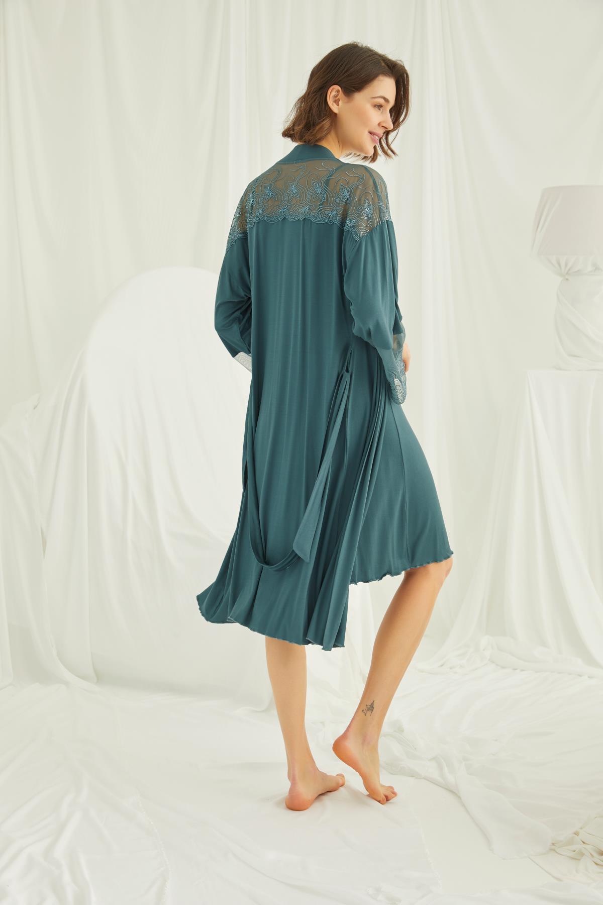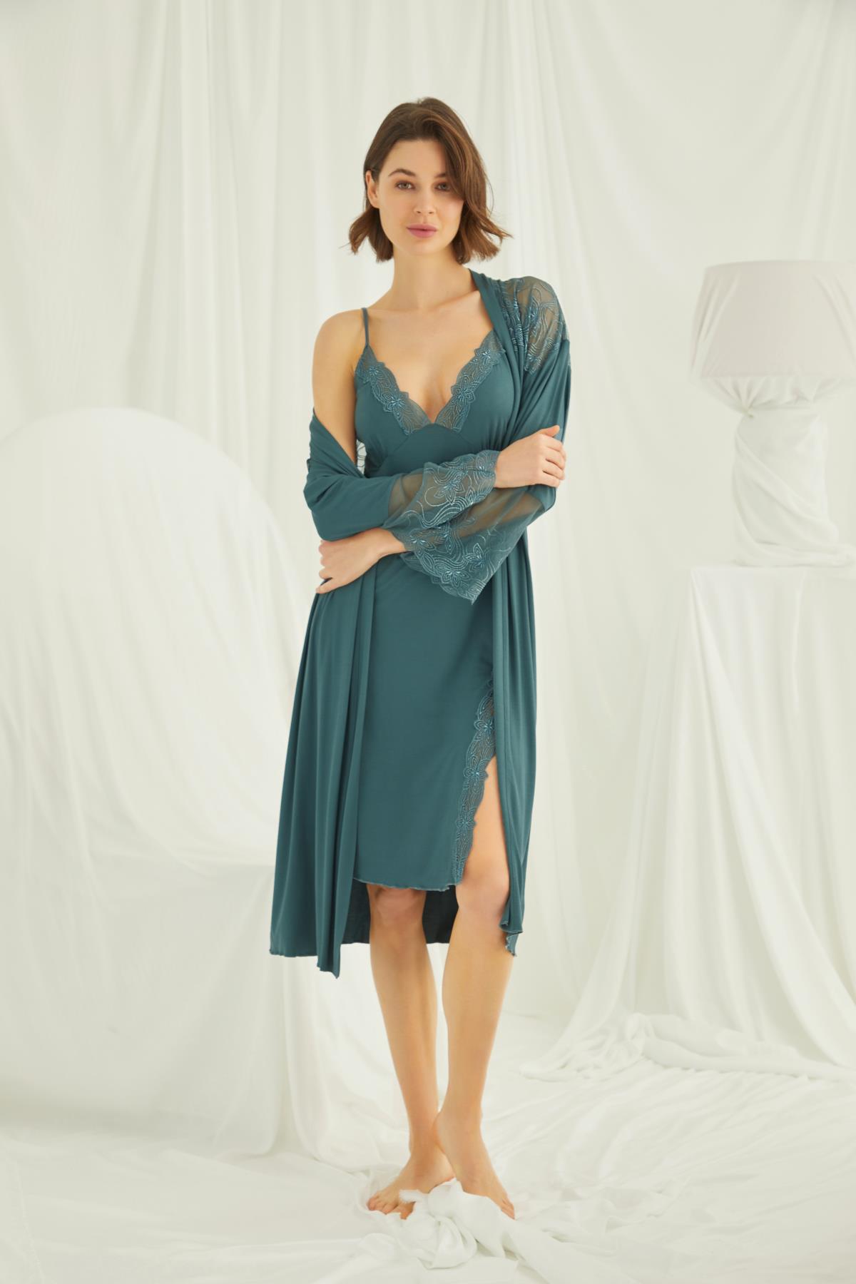 Sabahlık: Su yeşili renklidir, kol ve omuz bölgesi brode dantellidir, örme kumaştır. Gecelik: Su yeşili renklidir, derin V yaka dekoltelidir, ayarlanabilir ip askılıdır, yırtmaçlıdır, yakası ve yırtmaç kısmı brode dantellidir, örme kumaştır.