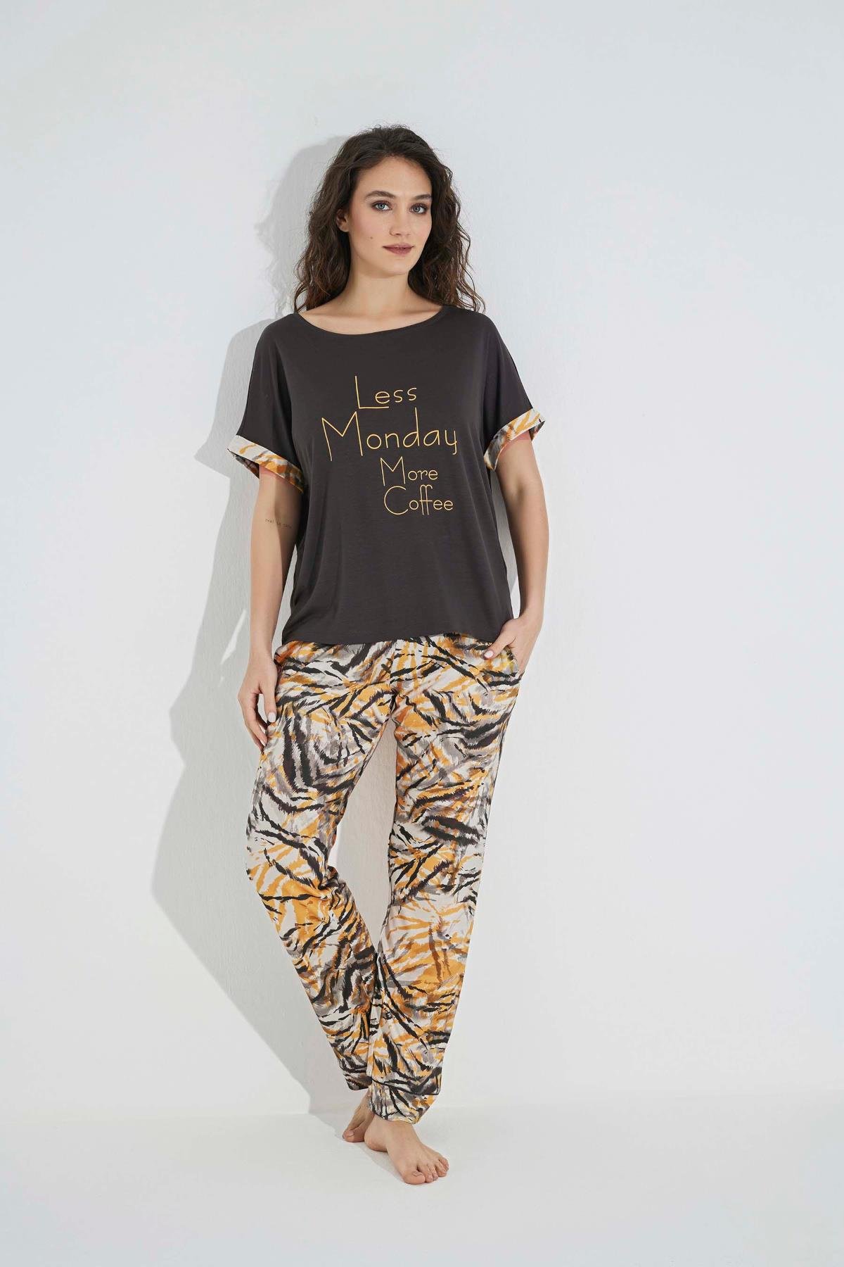 Üst: Antrasit renklidir, kısa kolludur, bisiklet yakalıdır, ""Less Mondey More Coffee"" yazılıdır, örme kumaştır. Alt: Desenlidir, ceplidir, örme kumaştır.