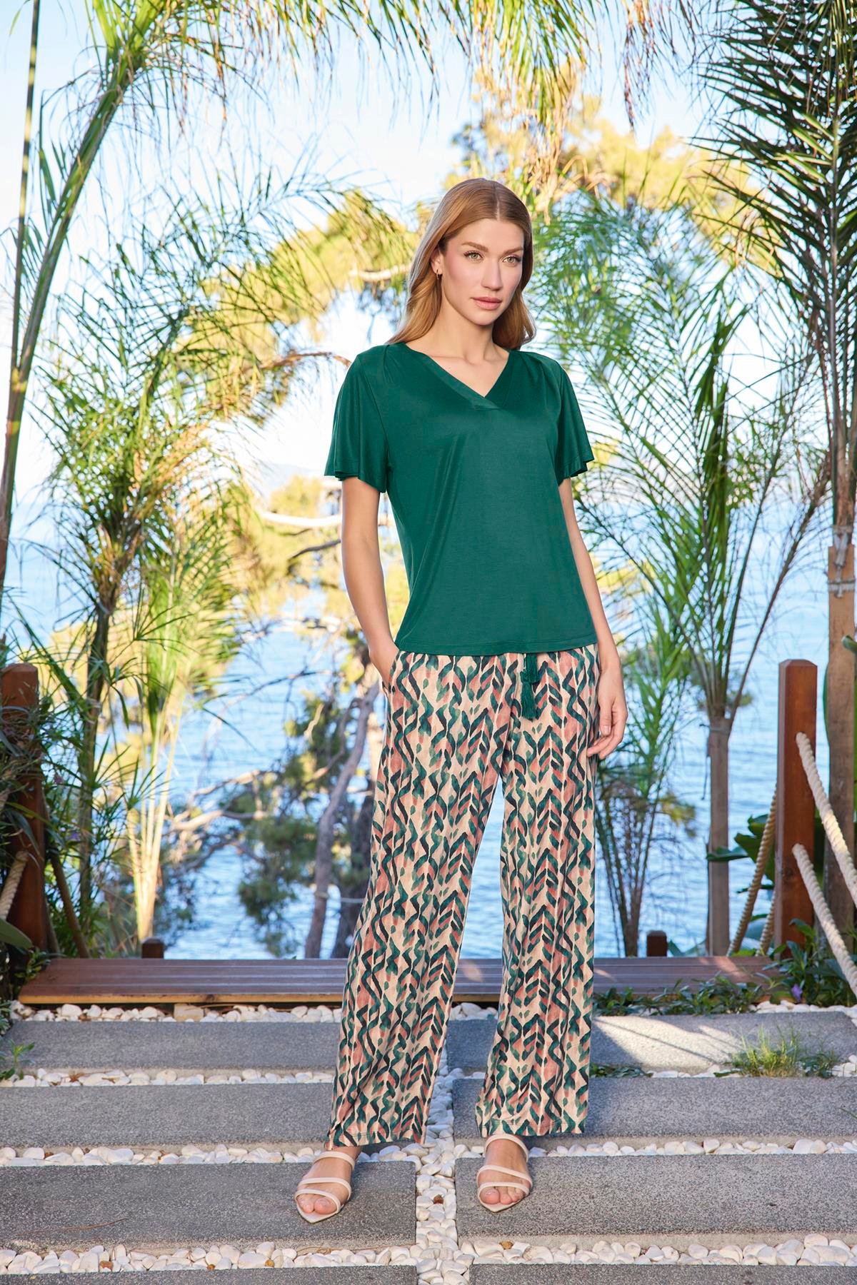 Üst: Yeşil renklidir, V yakalıdır, kısa kolludur, örme kumaştır. Alt: Desenlidir, ceplidir, önden bağcıklı püskül detaylıdır, örme kumaştır.