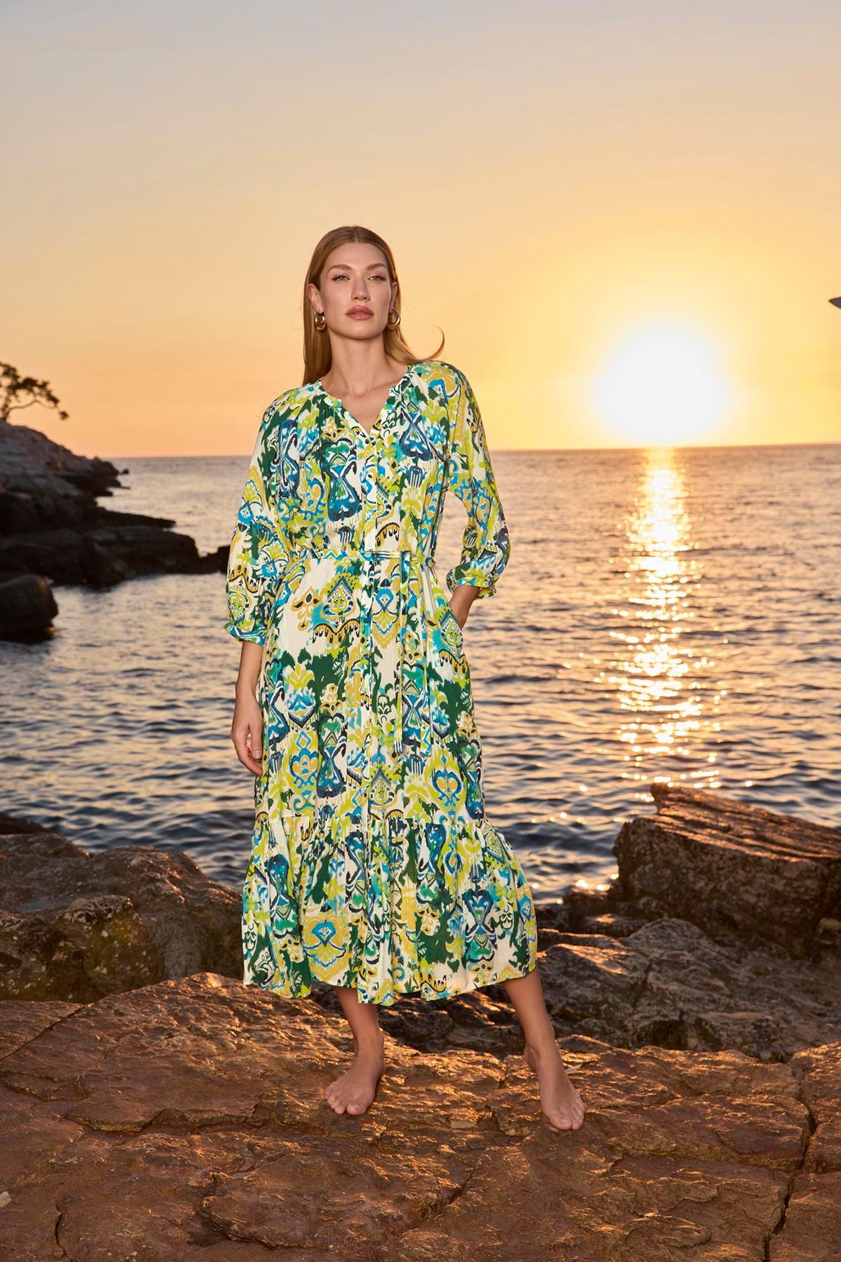 Elbise: Desenlidir, truvakar kolludur, V yakalıdır, önü düğmelidir, kuşaklıdır, ceplidir, dokuma kumaştır.