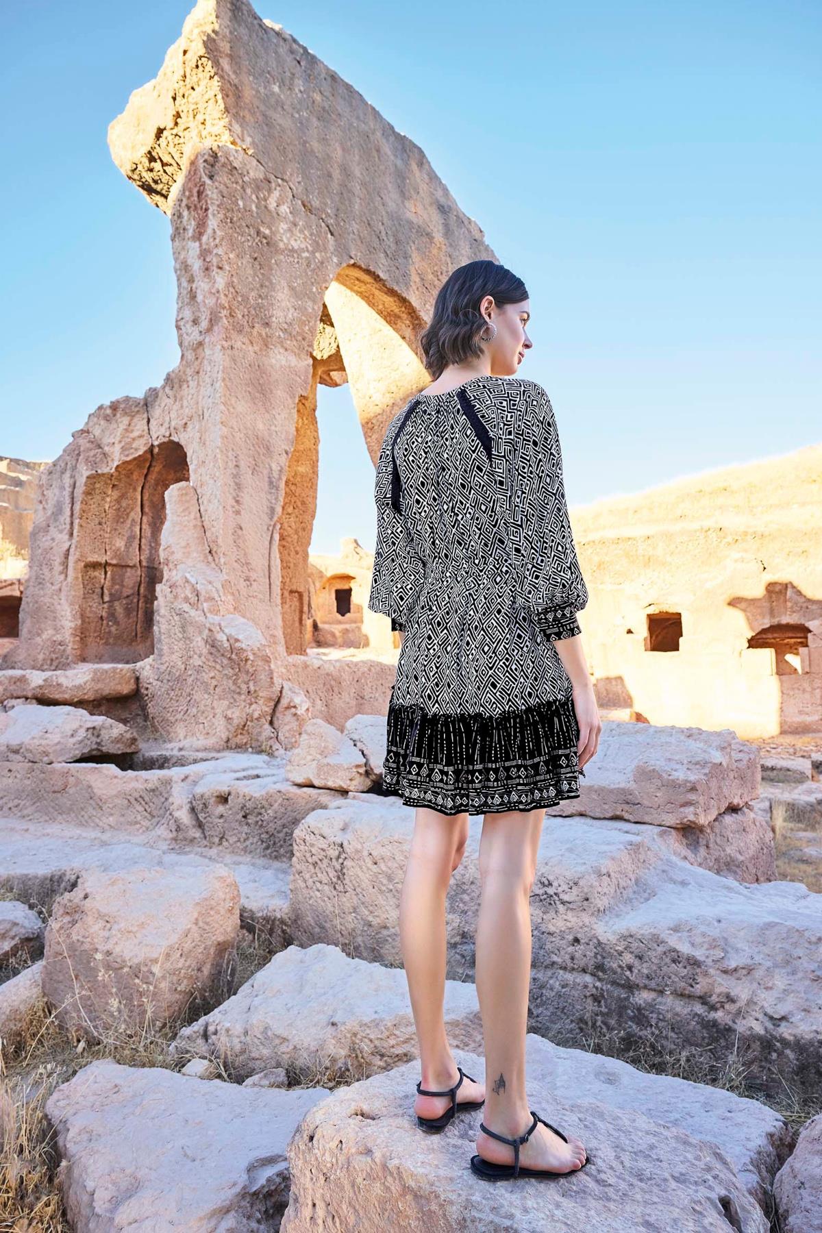 Elbise: Etnik desenlidir, V yakalıdır, truvakar kolludur, kol ağzı lastiklidir, dokuma kumaştır.