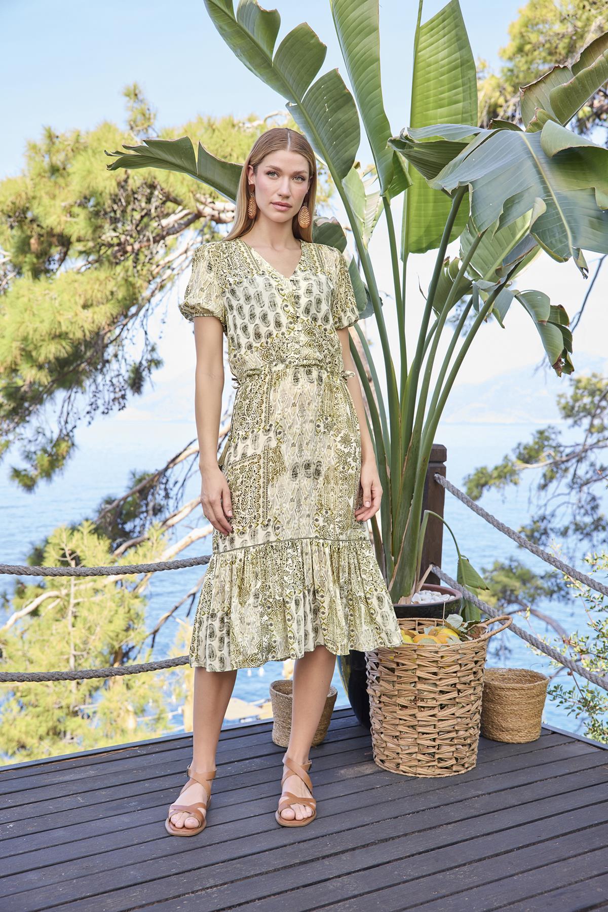 Elbise: Etnik desenlidir, kısa kolludur, V yakalıdır, yaka altından düğmelidir, dokuma kumaştır.