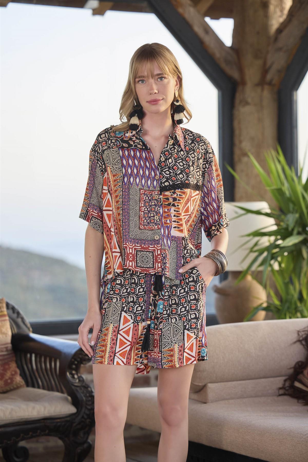 Üst: Etnik desenlidir, gömlek yakalıdır, kısa kolludur, önü düğmelidir, dokuma kumaştır. Alt: Etnik desenlidir, ceplidir, önden bağcıklı püskül detaylıdır, dokuma kumaştır.