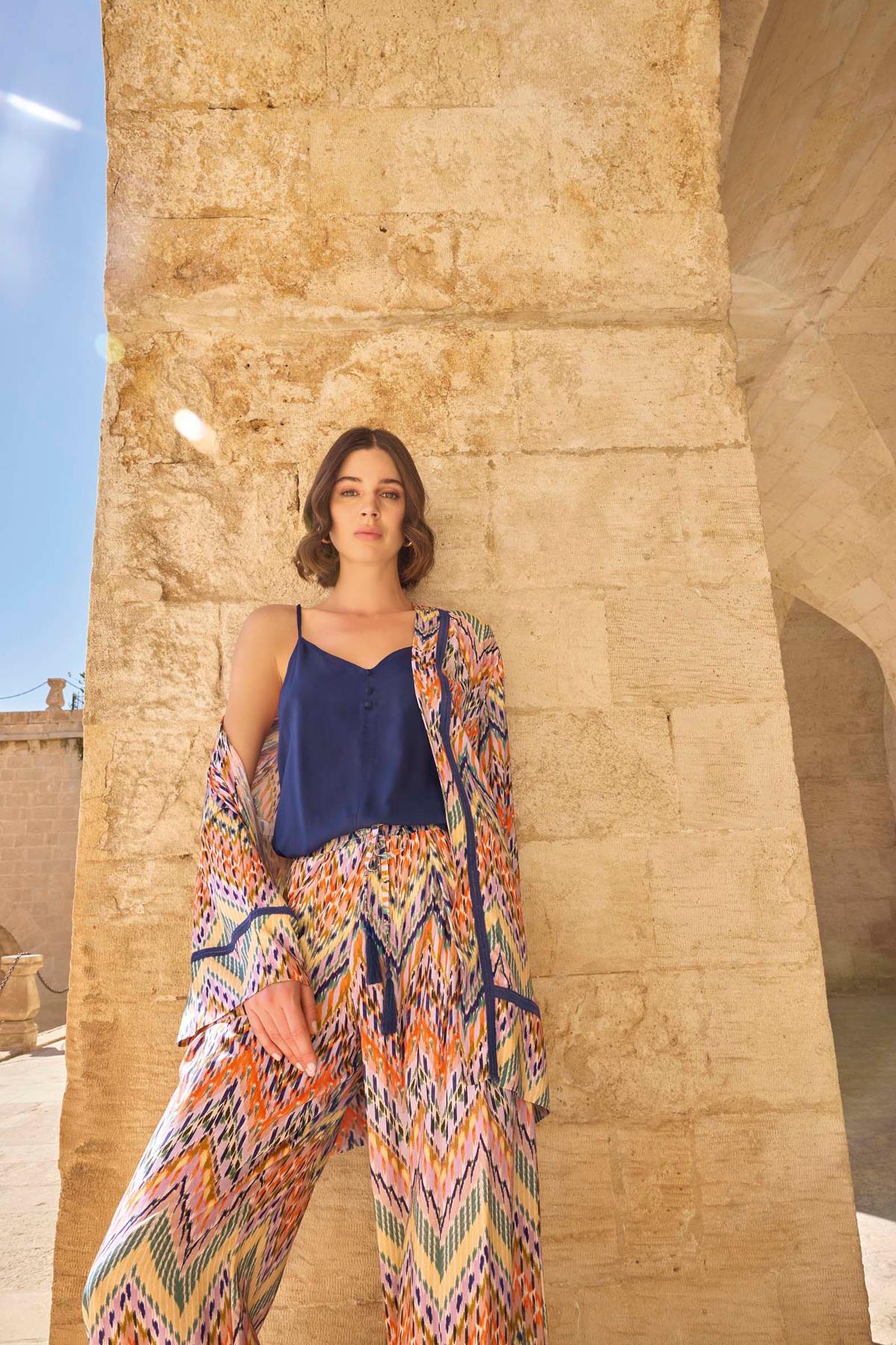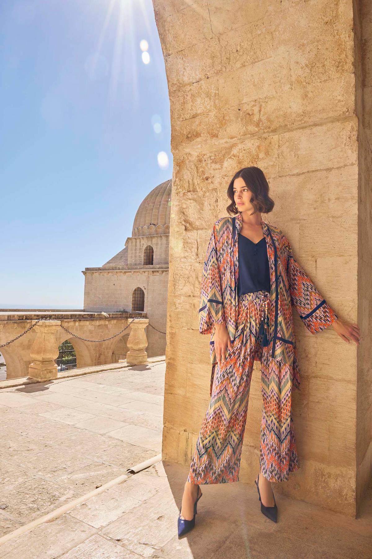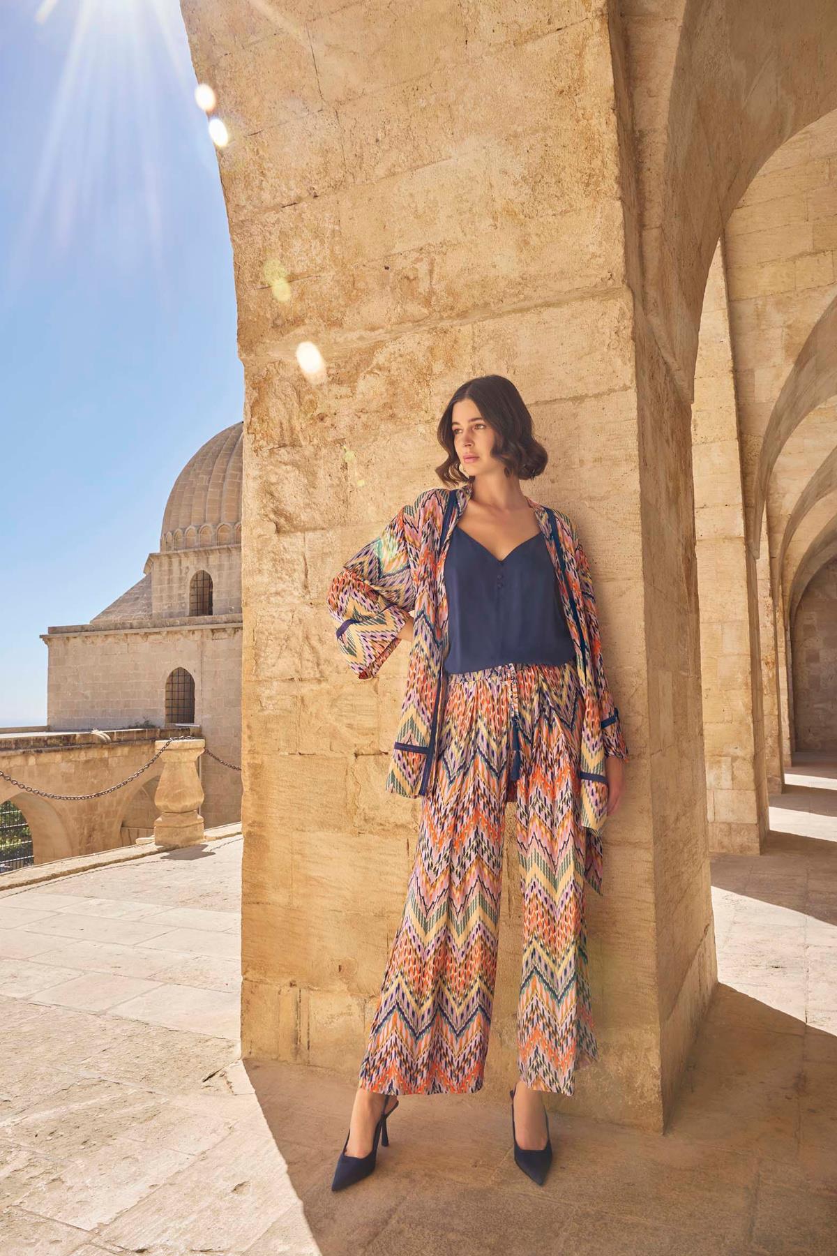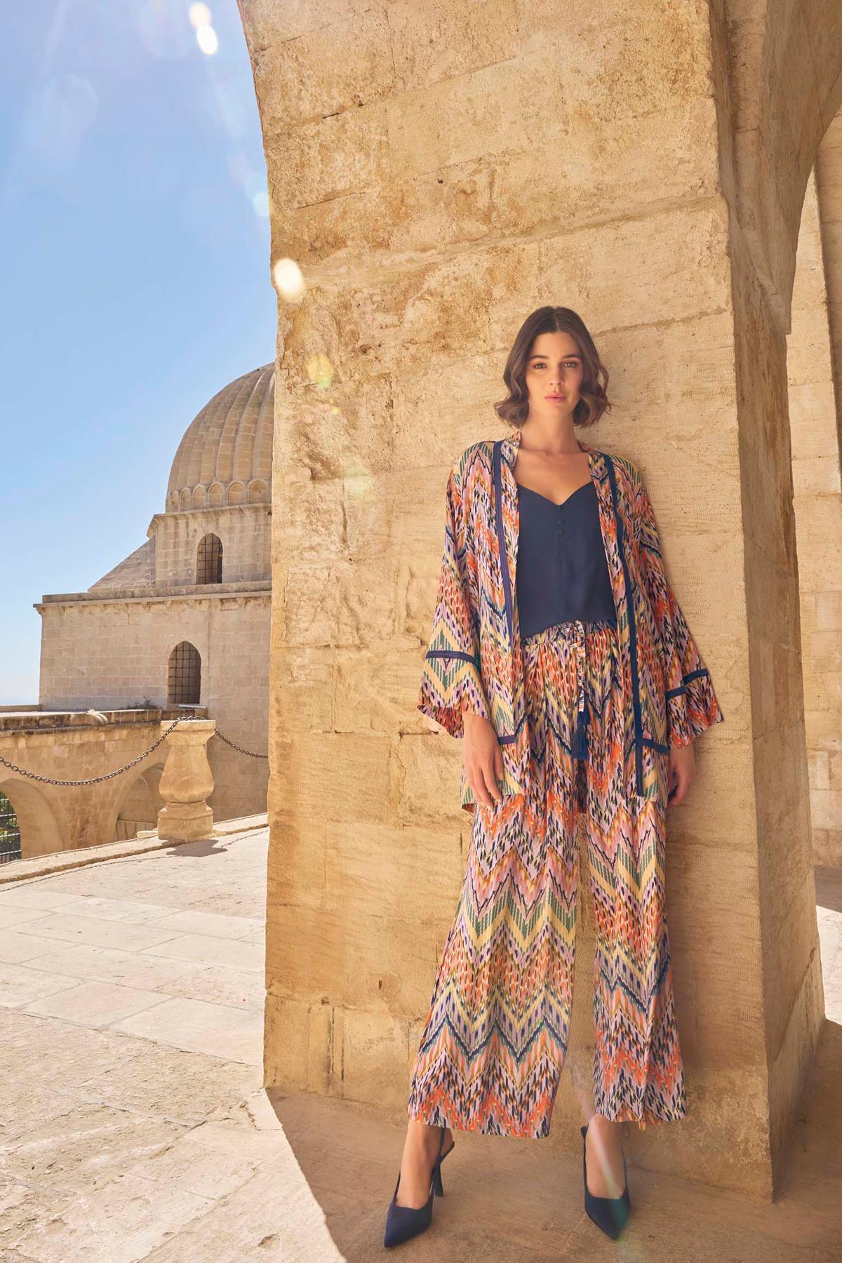Sabahlık: Etnik desenlidir, uzun kolludur, kuşaklıdır, dokuma kumaştır. Üst: V yakalıdır, lacivert renklidir, sıfır kolludur, dokuma kumaştır. Alt: Etnik desenlidir, ceplidir, önden bağcıklı püskül detaylıdır, dokuma kumaştır.