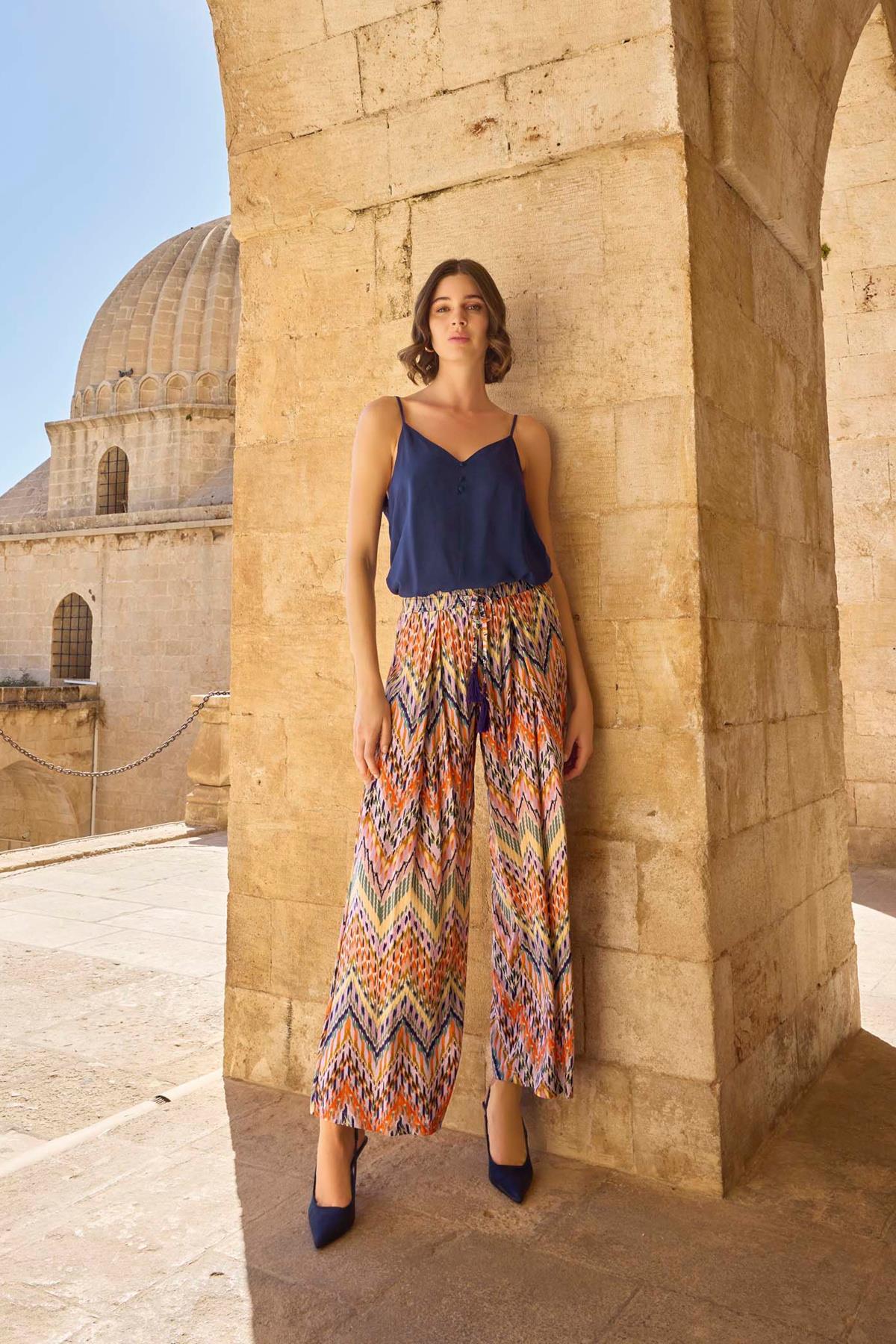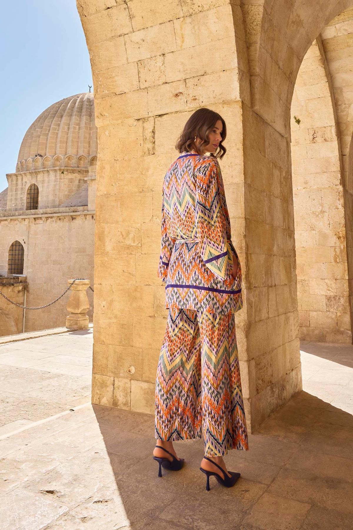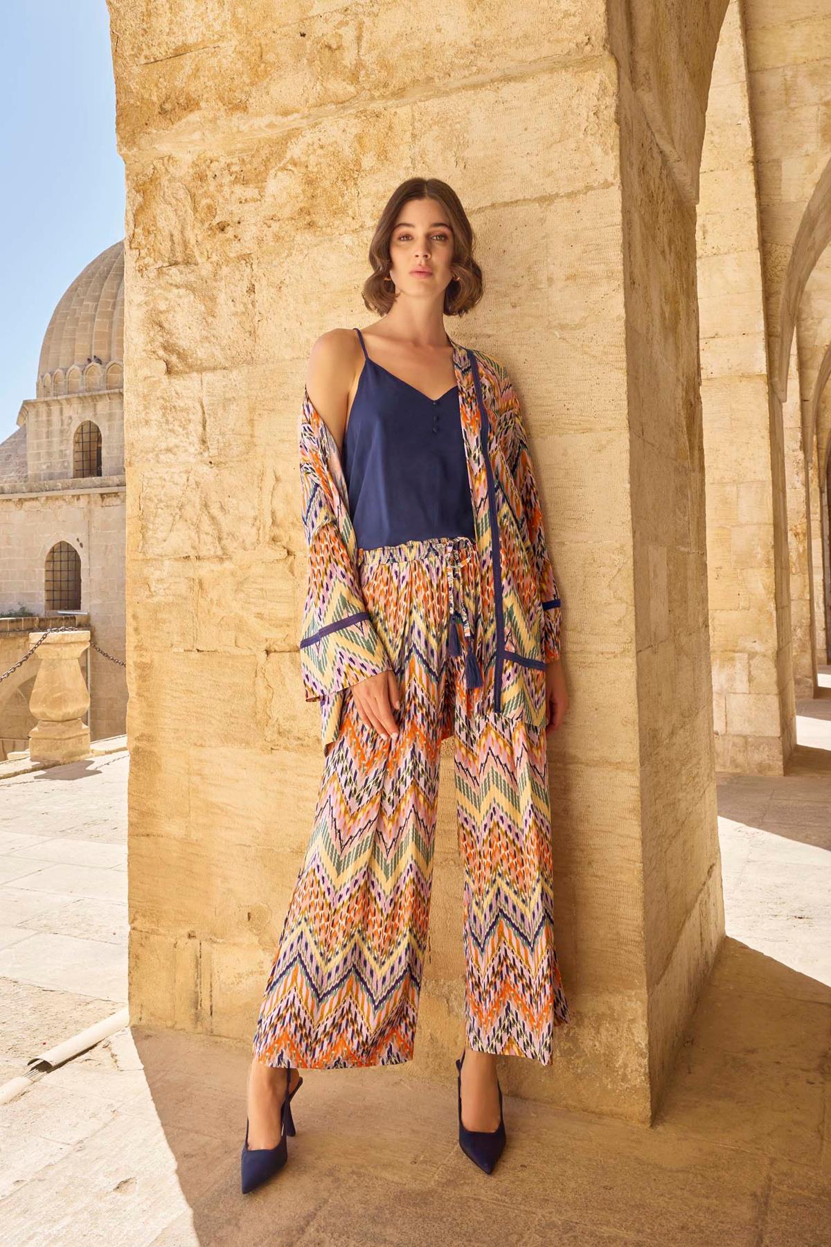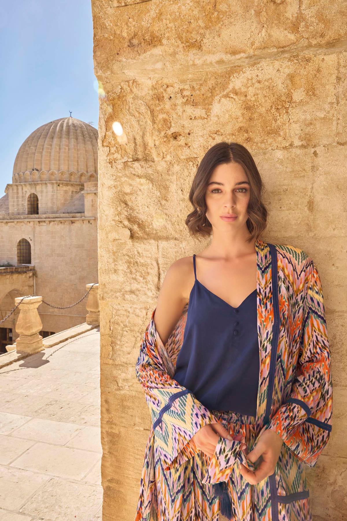Sabahlık: Etnik desenlidir, uzun kolludur, kuşaklıdır, dokuma kumaştır. Üst: V yakalıdır, lacivert renklidir, sıfır kolludur, dokuma kumaştır. Alt: Etnik desenlidir, ceplidir, önden bağcıklı püskül detaylıdır, dokuma kumaştır.