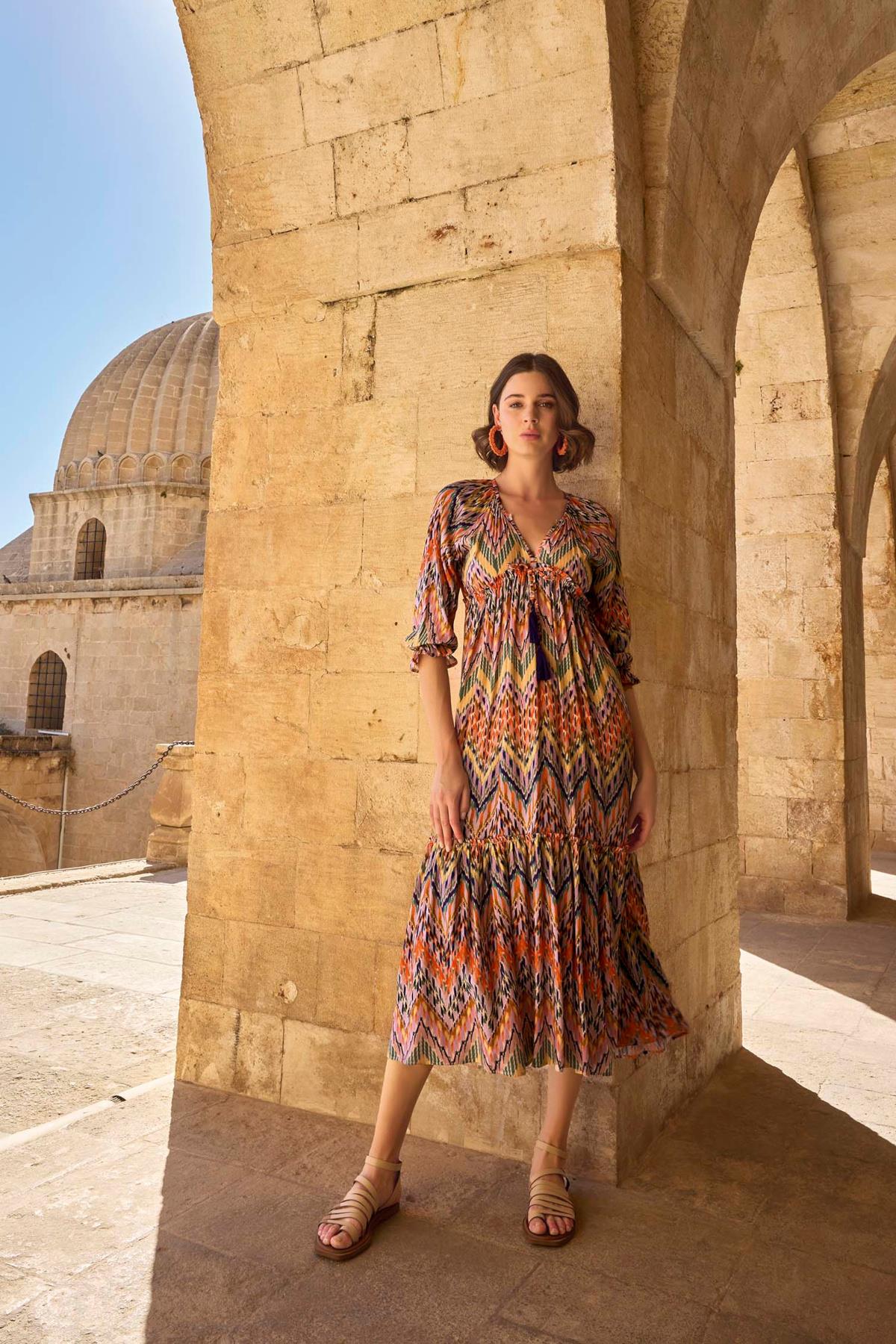 Elbise: Etnik desenlidir, V yakalıdır, truvakar kolludur, kol ağzı lastiklidir, önden bağcıklı püskül detaylıdır, dokuma kumaştır.
