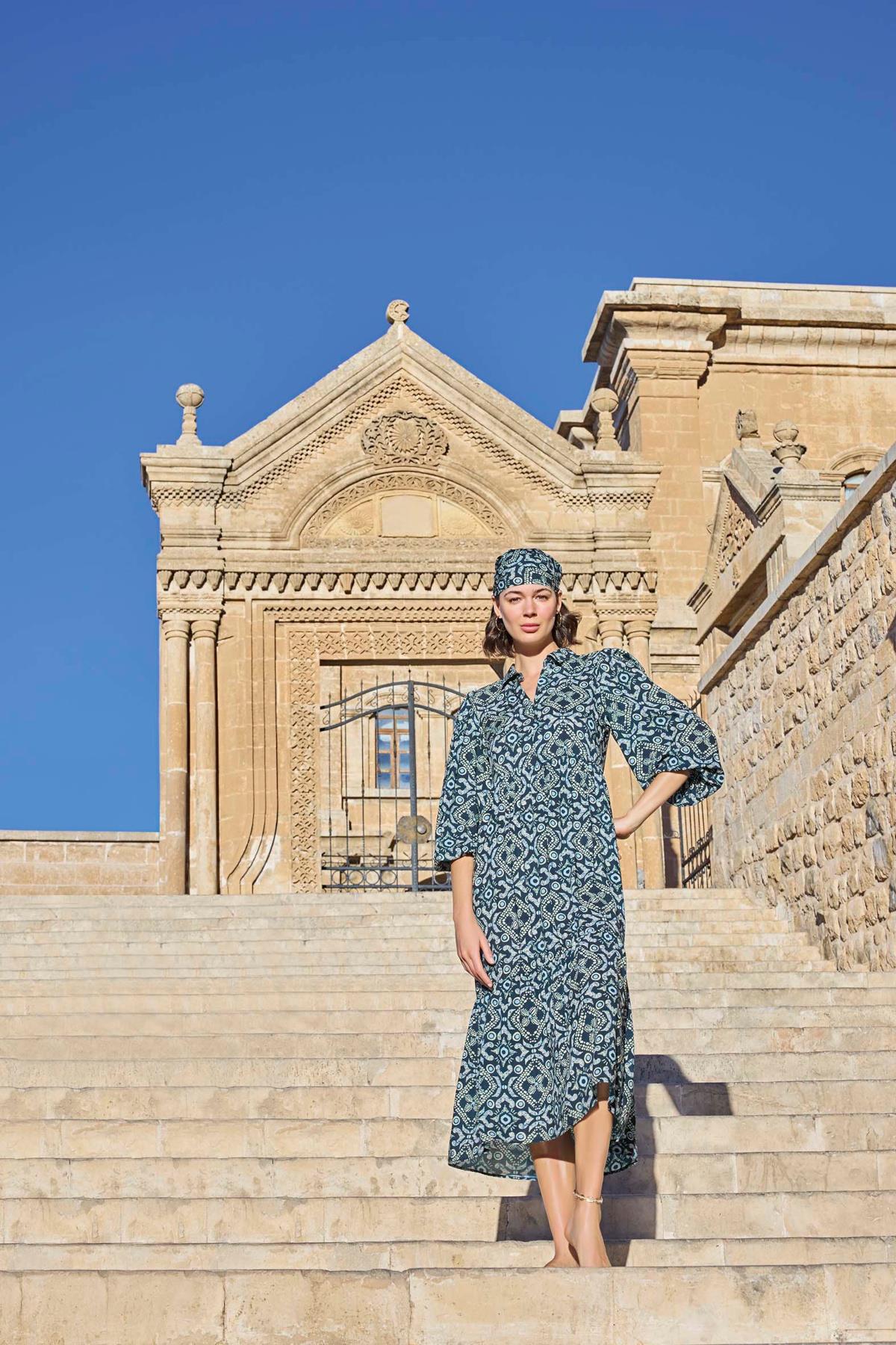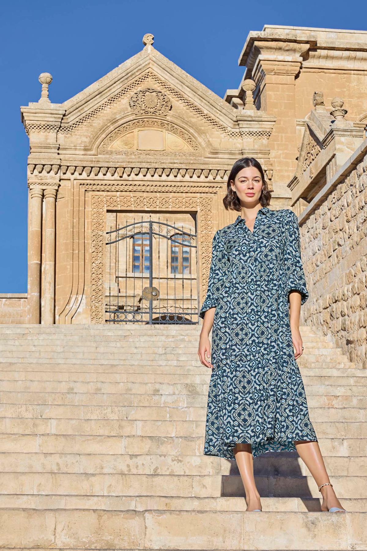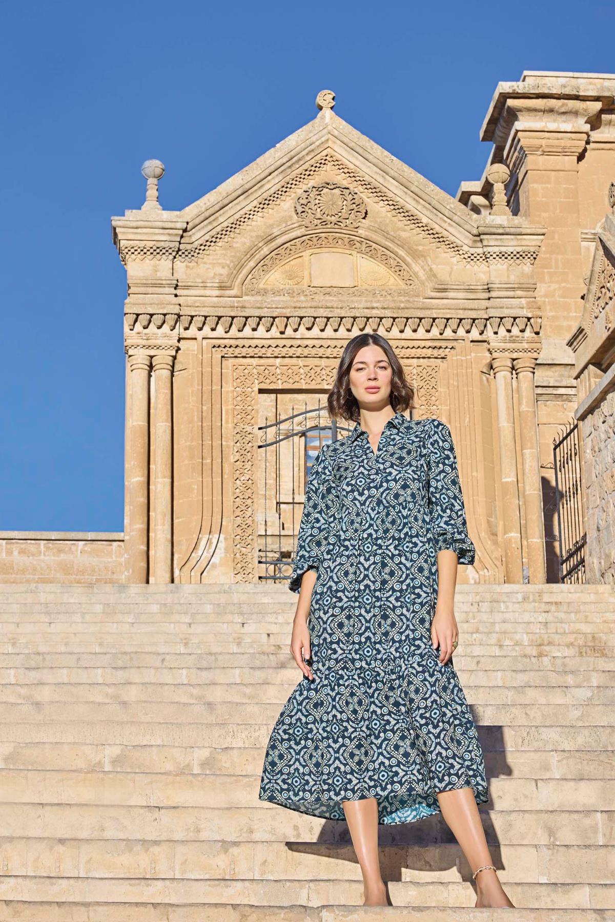 Elbise: Lacivert zemin üzerine etnik desenlidir, gömlek yakalıdır, truvakar kolludur, kol ağzı lastiklidir, dokuma kumaştır.