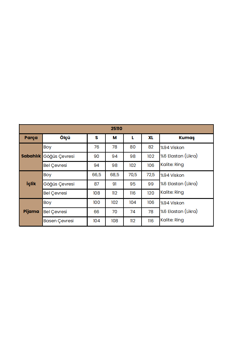 Sabahlık: Etnik desenlidir, uzun kolludur, kuşaklıdır, örme kumaştır. Üst: Yeşil renklidir, derin V yakalıdır, yakası ve göğüs alt kısmı ile kol altı dantellidir, emzirme için askılardan açılır durumdadır, ayarlanabilir lastik askılıdır, örme kumaştır. Pijama: Etnik desenlidir, örme kumaştır.