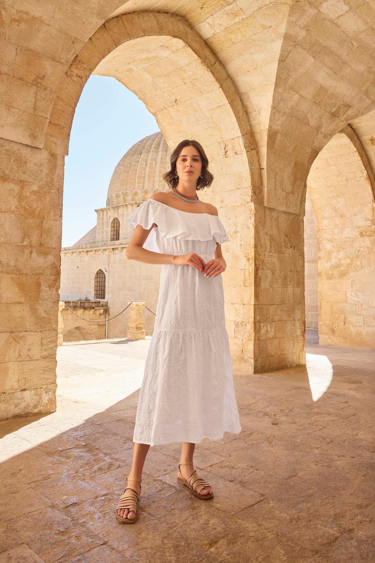 Elbise: Beyaz renklidir, kayık yakalıdır, kısa kolludur, dokuma kumaştır.