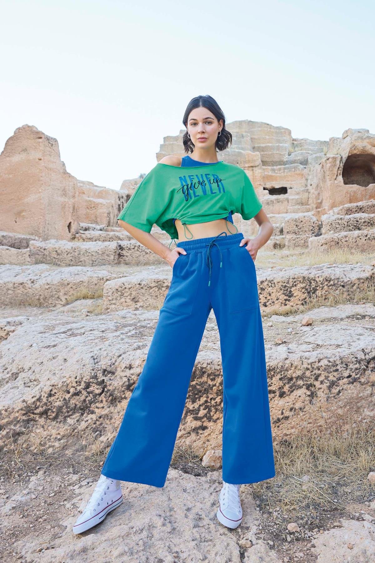 Üst: Yeşil renklidir, kısa kolludur, ""Never Give Up"" yazılıdır, pis yakalıdır, örme kumaştır. Crop: Mavi renklidir, kalın askılıdır, bisiklet yakalıdır, örme kumaştır. Alt: Mavi renklidir, ceplidir, bağcıklıdır, örme kumaştır.
