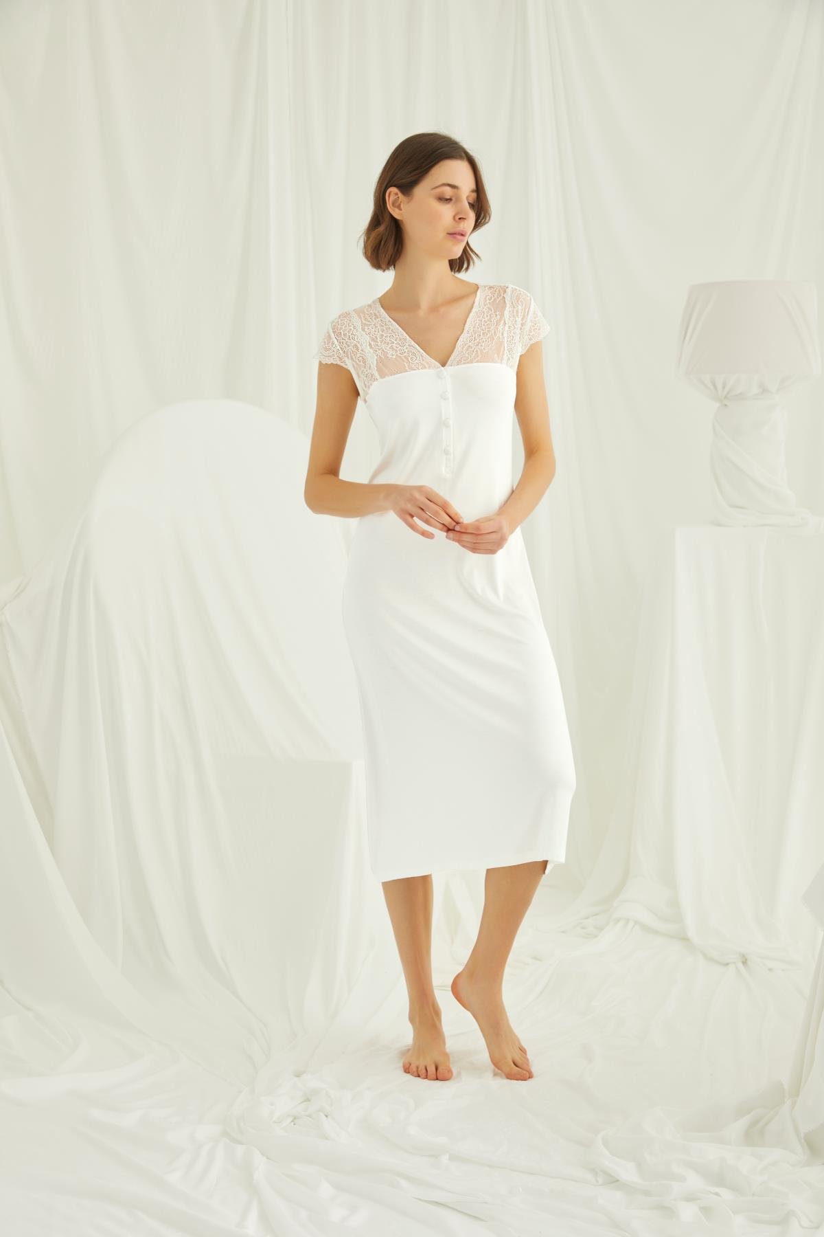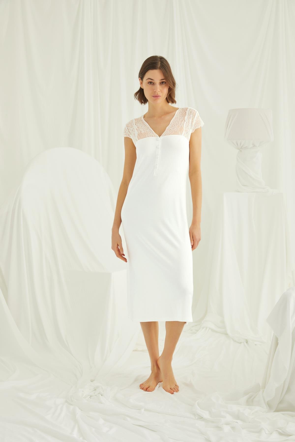 Gecelik: V yakalıdır, kısa kolludur, kolu ve omzu göğüs hizasına kadar dantellidir, yakasının altı düğmelidir, ekru renklidir, örme kumaştır.