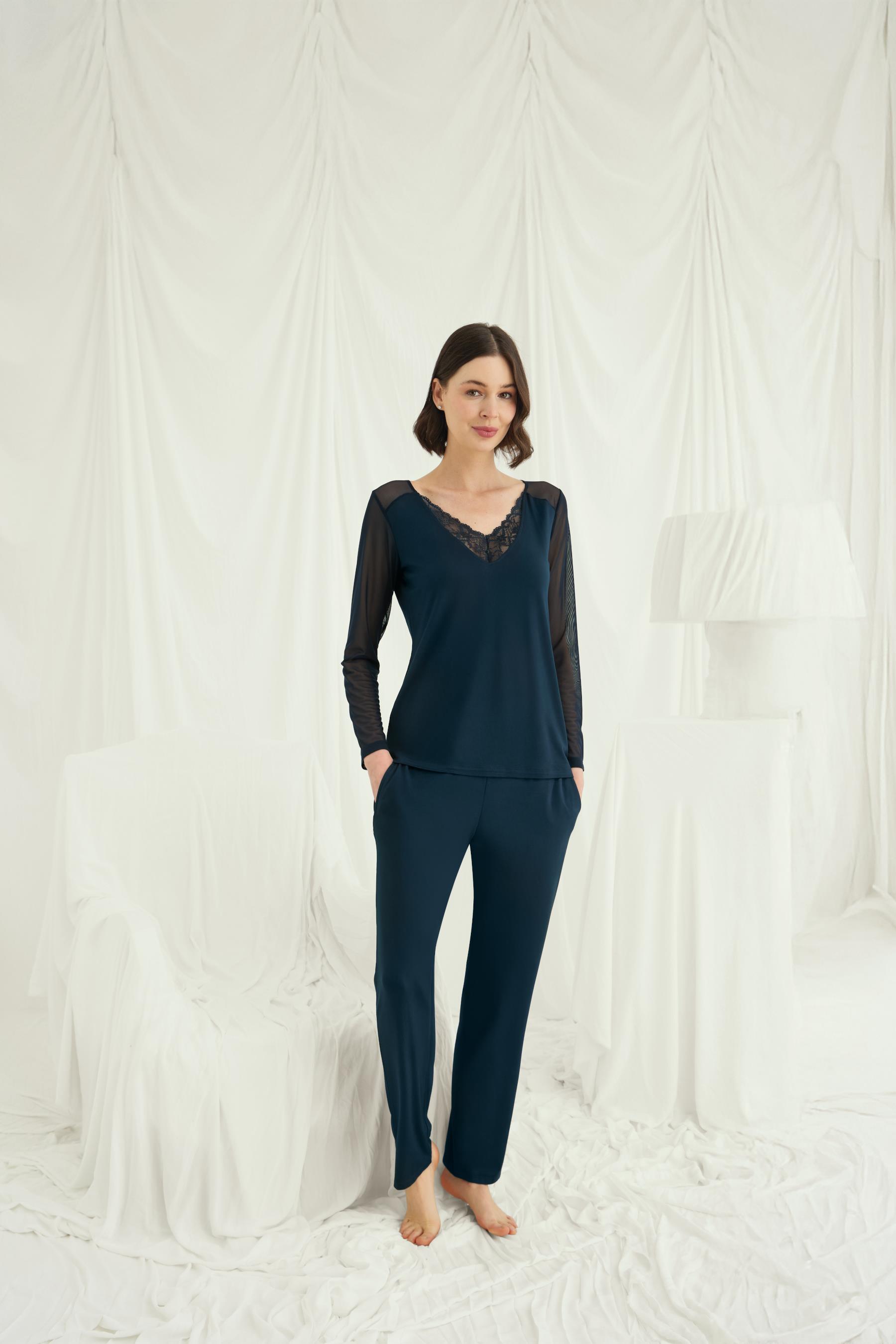 Üst: Gece mavisi renklidir, V yakalıdır, yakası dantellidir, uzun kolludur, kolları tüllüdür, sırt dekoltelidir, Örme kumaştır. Alt: Gece mavisi renklidir, ceplidir, örme kumaştır.