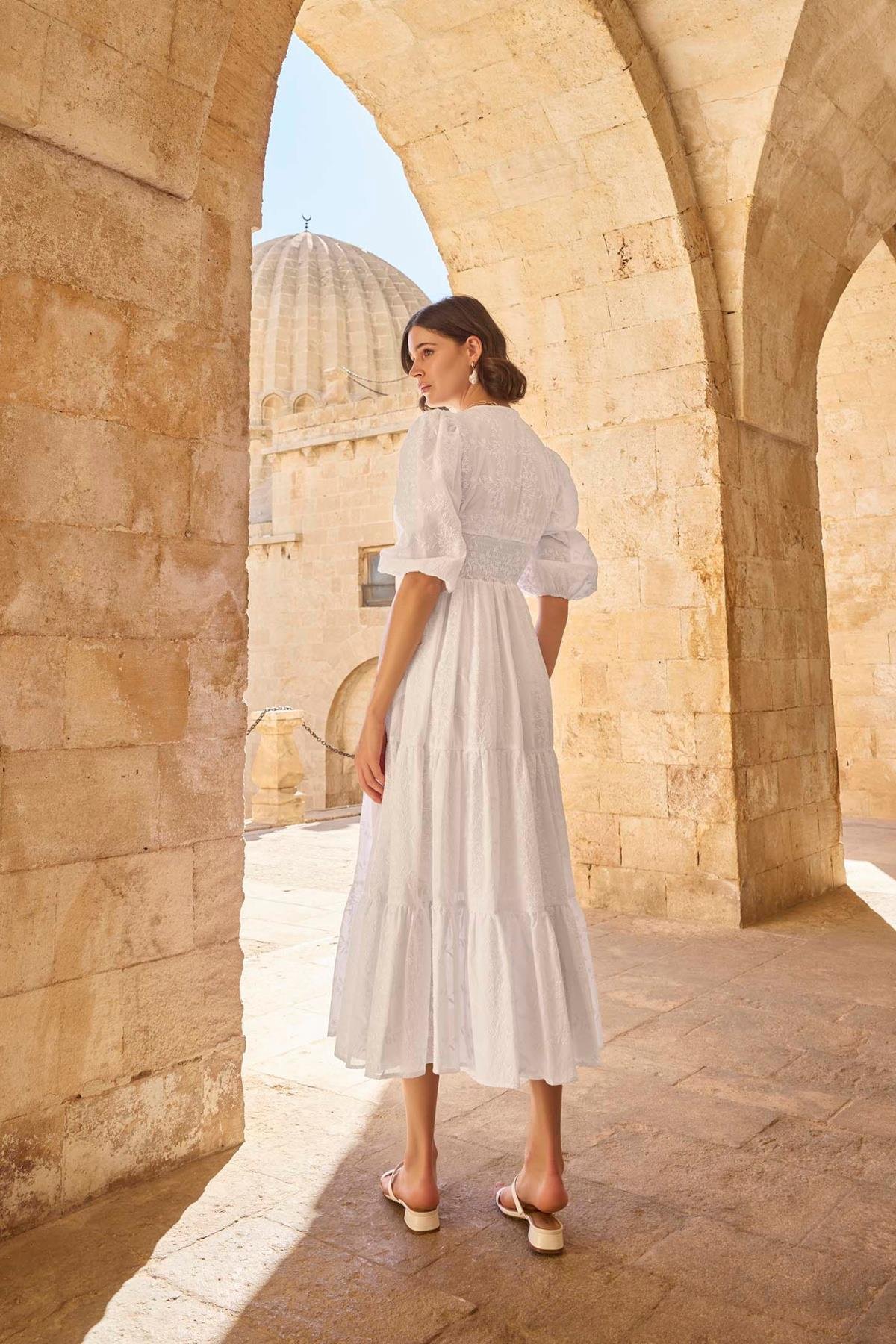 Elbise: Beyaz renklidir, V yakalıdır, truvakar kolludur, kol ağzı lastiklidir, dokuma kumaştır.