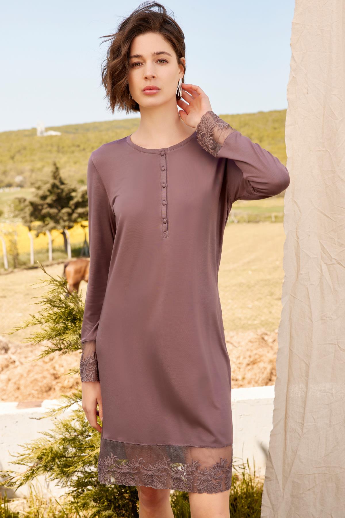 Gecelik: Bisiklet yakalıdır, uzun kolludur, önü düğmelidir, kol ağzı ve etek kısmı dantellidir, kahverengi renklidir, örme kumaştır.