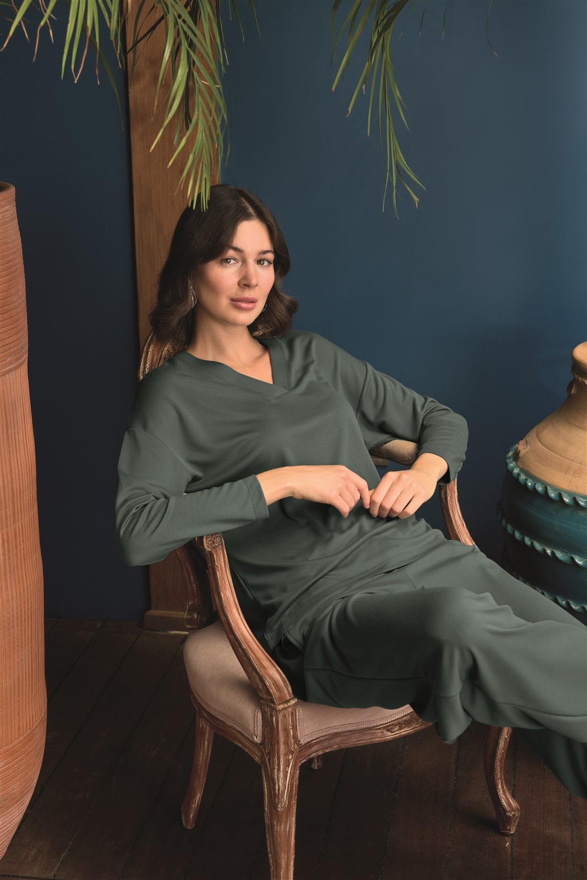 Üst: Yeşil renklidir, V yakalıdır, uzun kolludur, örme kumaştır. Alt: Yeşil renklidir, ceplidir, örme kumaştır.