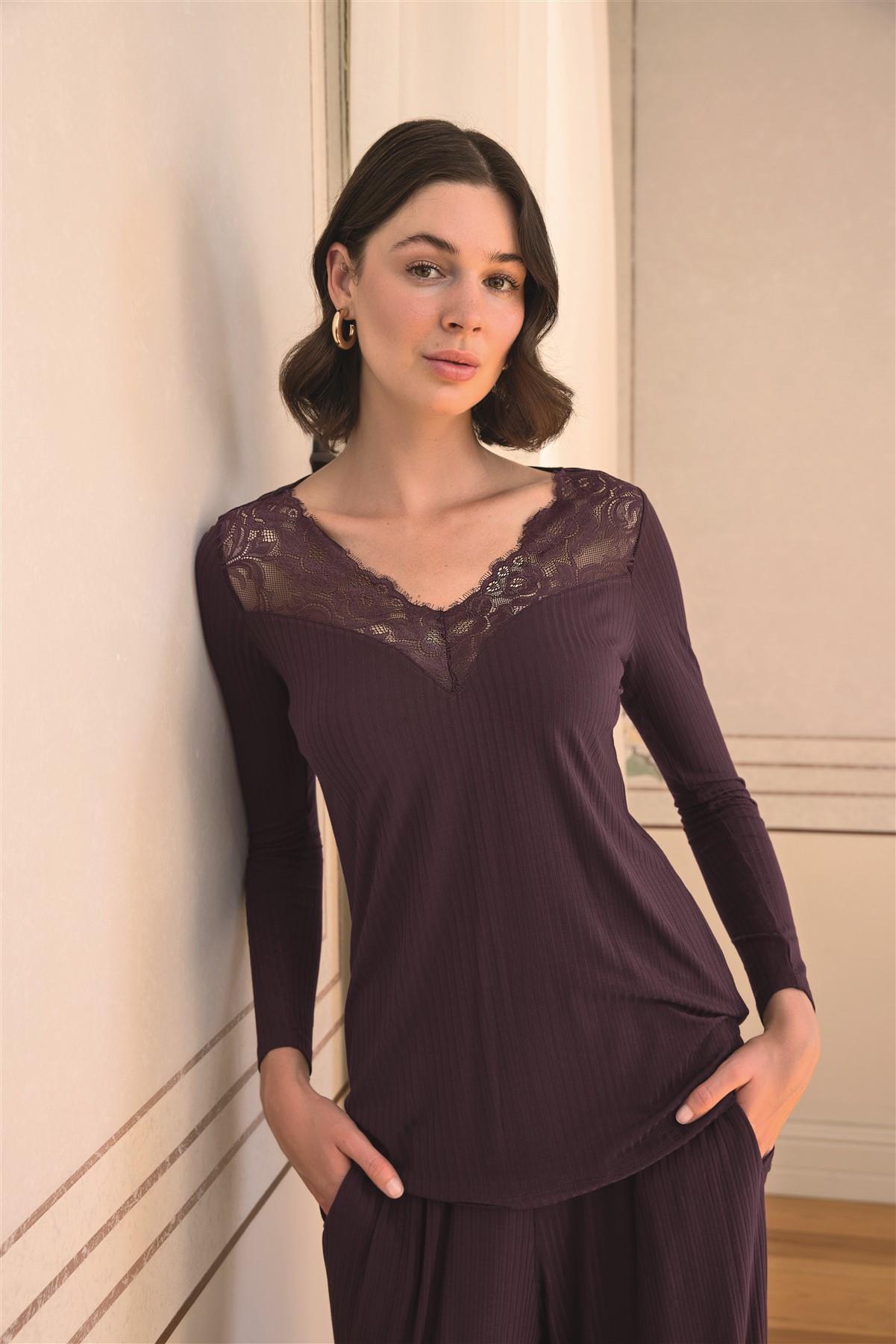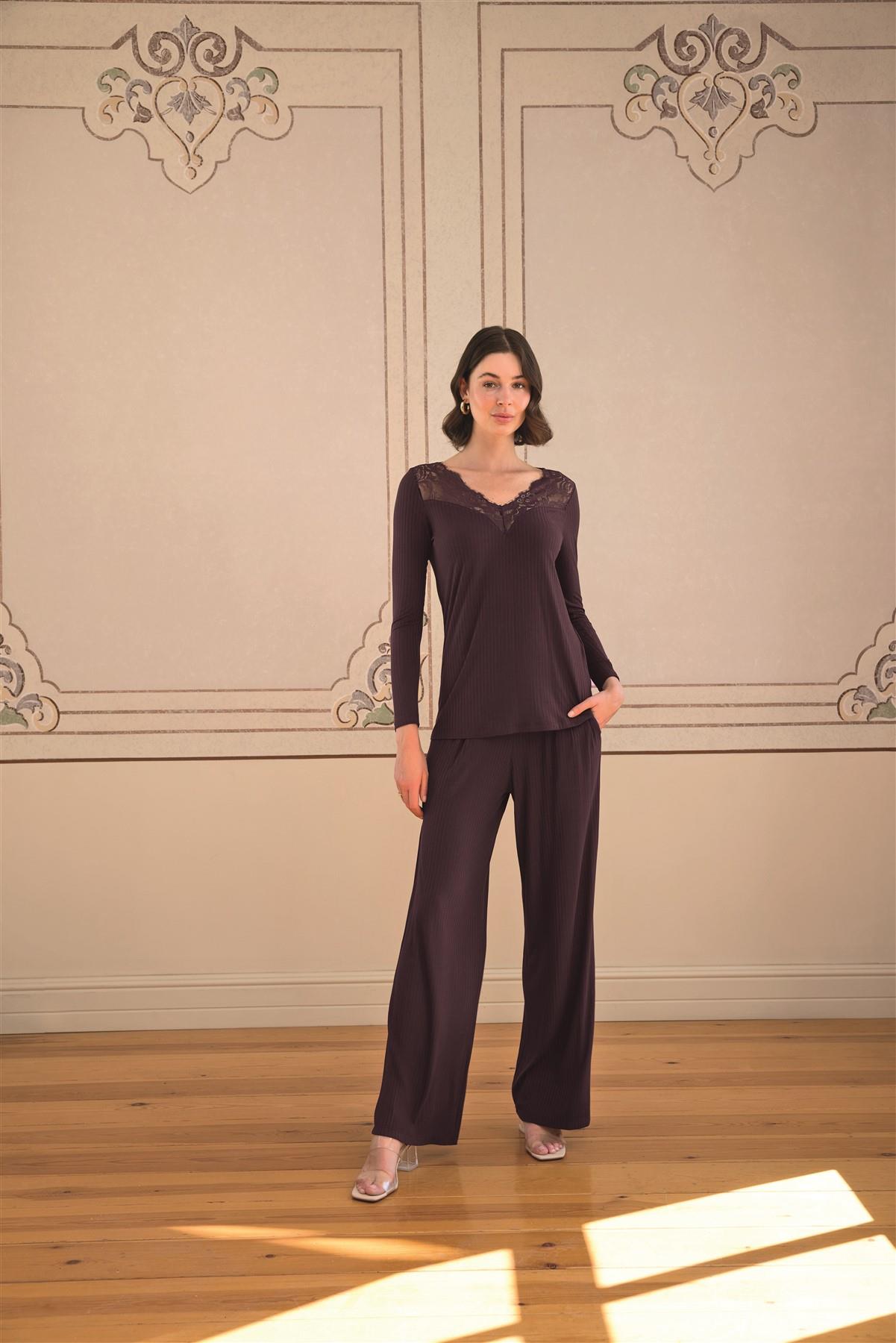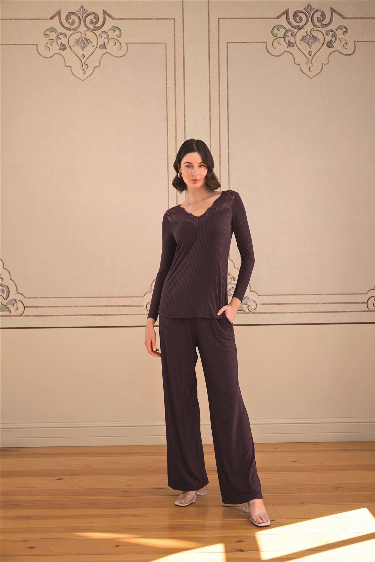Üst: Mürdüm renklidir, V yakalıdır, uzun kolludur, yakası dantellidir, örme kumaştır. Alt: Mürdüm renklidir, ceplidir, örme kumaştır.