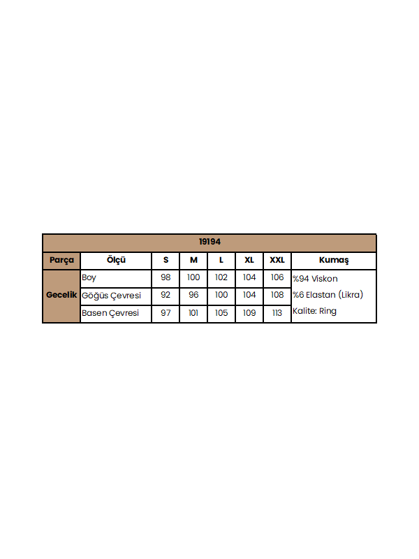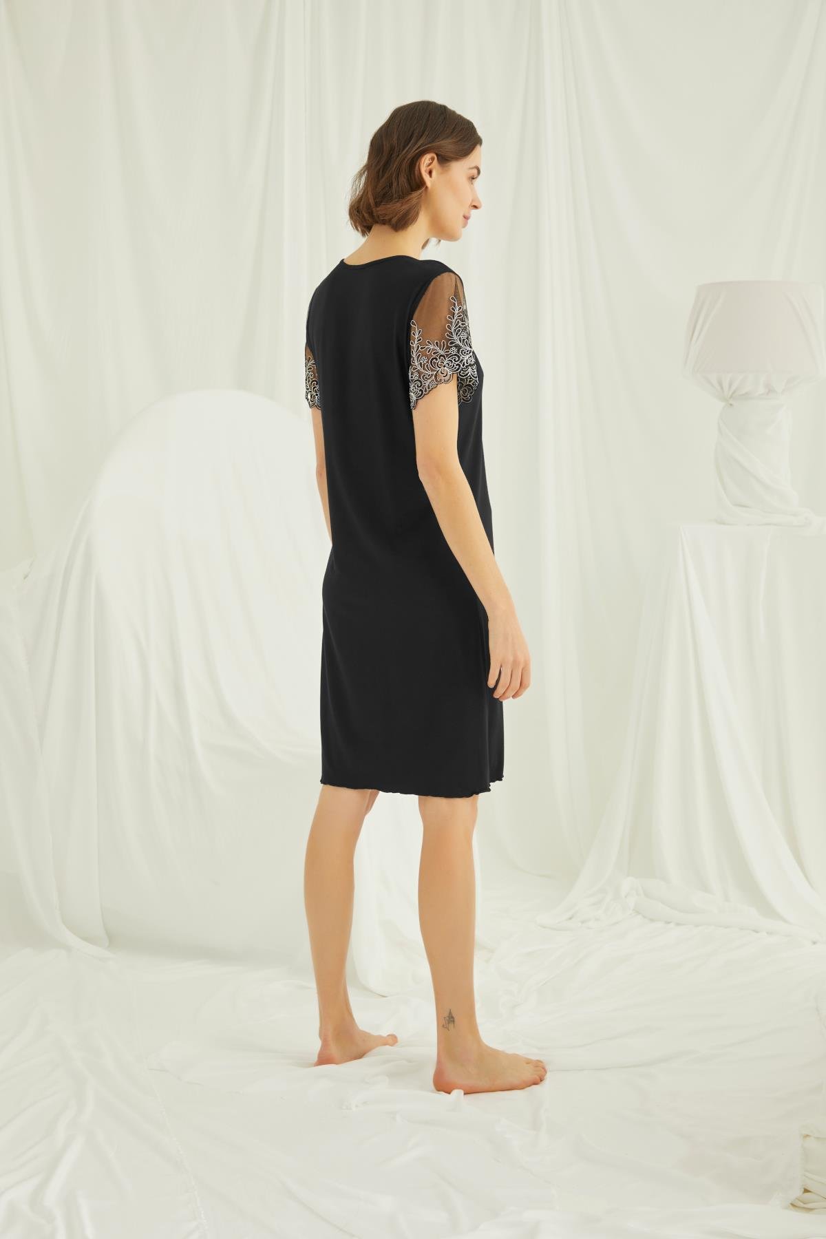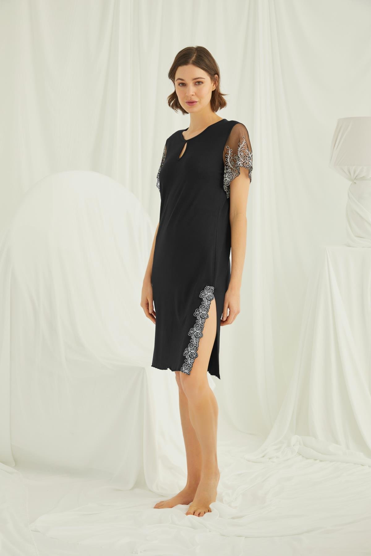 Gecelik: Siyah renklidir, bisiklet yakalıdır, yakası damla detaylıdır, kısa kolludur, yırtmaçlıdır, yırtmaç ve kolu brode dantellidir, örme kumaştır.