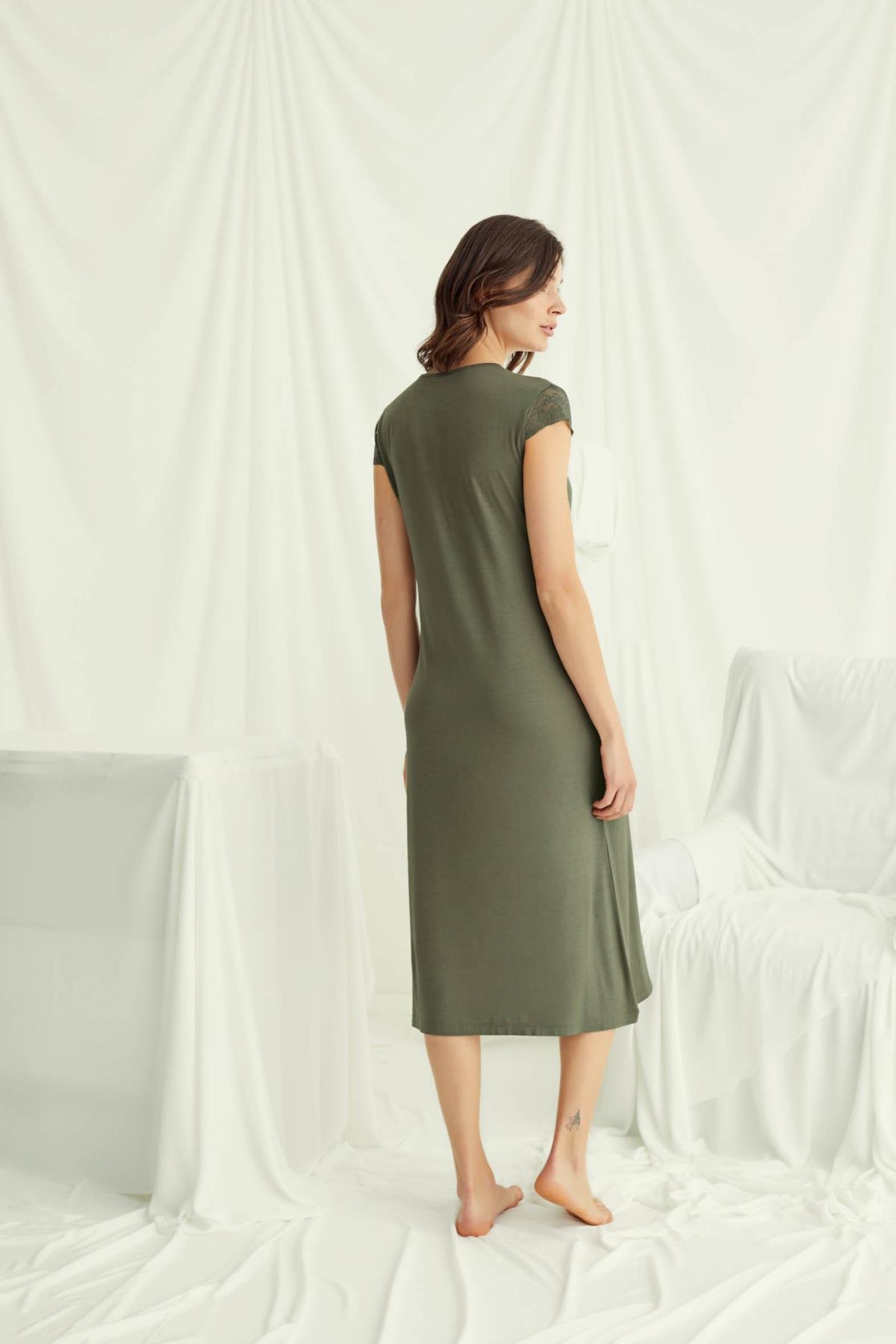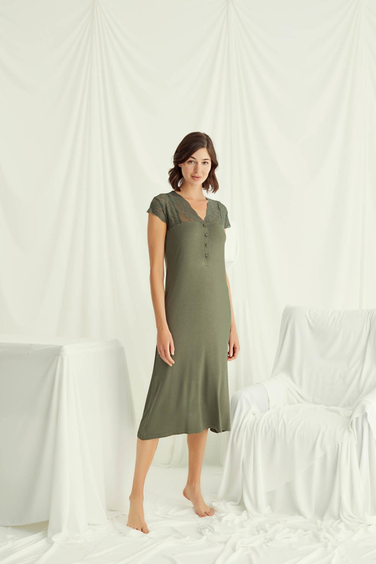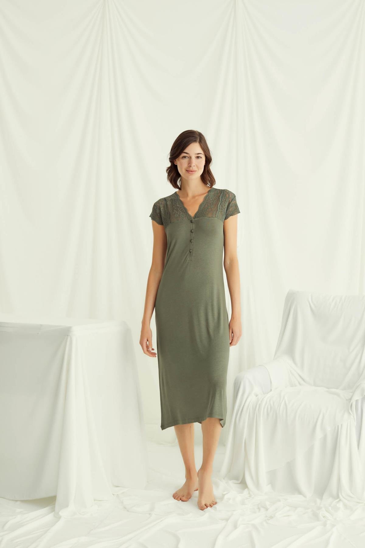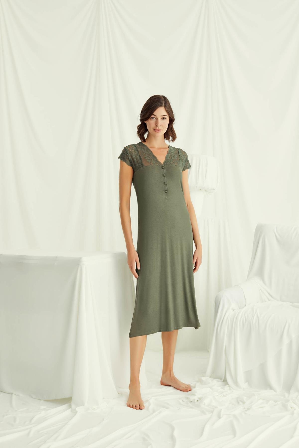 Gecelik: Haki renklidir, V yakalıdır, yakası ve kolu ile omuzdan göğüs hizasına kadar dantellidir, önü düğmelidir, kısa kolludur, örme kumaştır.