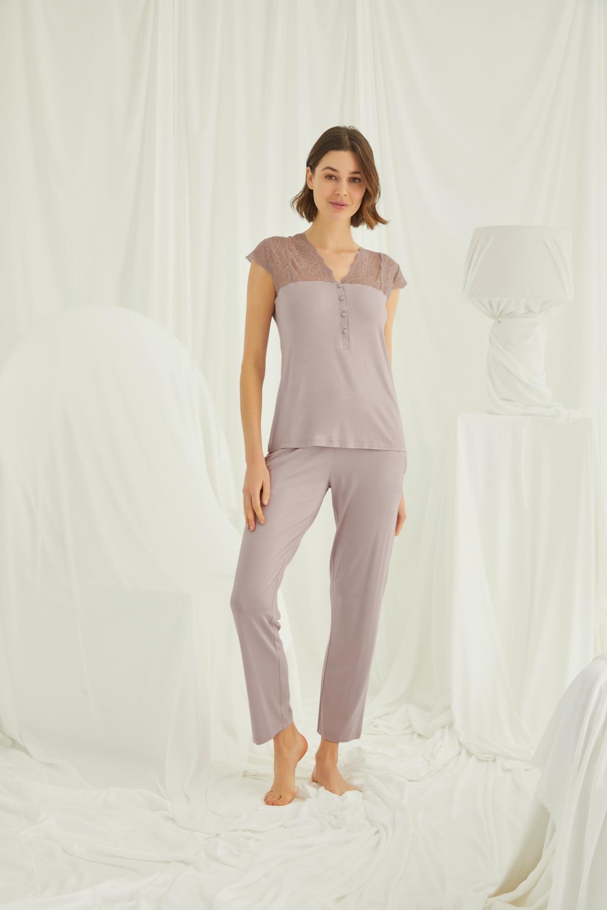 Üst: Vizon renklidir, V yakalıdır, kolu, omzu ve yakası dantellidir, yakasının altı düğmelidir, kısa kolludur, örme kumaştır. Alt: Vizon renklidir, ceplidir, örme kumaştır.