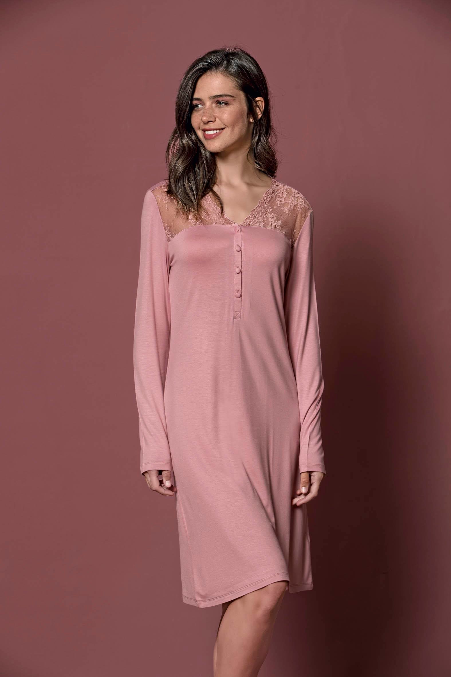 Gecelik: Pembe renklidir, V yakalıdır, yakası ve omuzdan göğüs hizasına kadar dantellidir, önü düğmelidir, uzun kolludur, örme kumaştır.