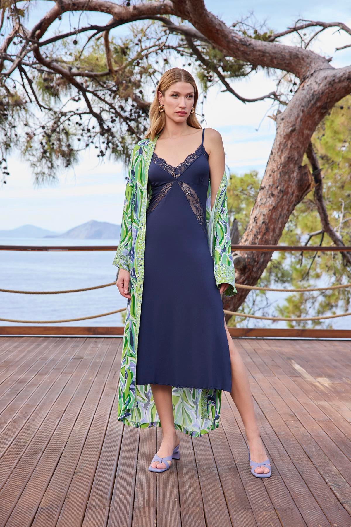 Sabahlık: Yaprak desenlidir, uzun kolludur, kuşaklıdır, örme kumaştır.Gecelik: Lacivert renklidir, derin V yaka dekoltelidir, ayarlanabilir ip askılıdır, yırtmaçlıdır, göğüs ve göğüs alt kısmı dantellidir, dokuma kumaştır.
