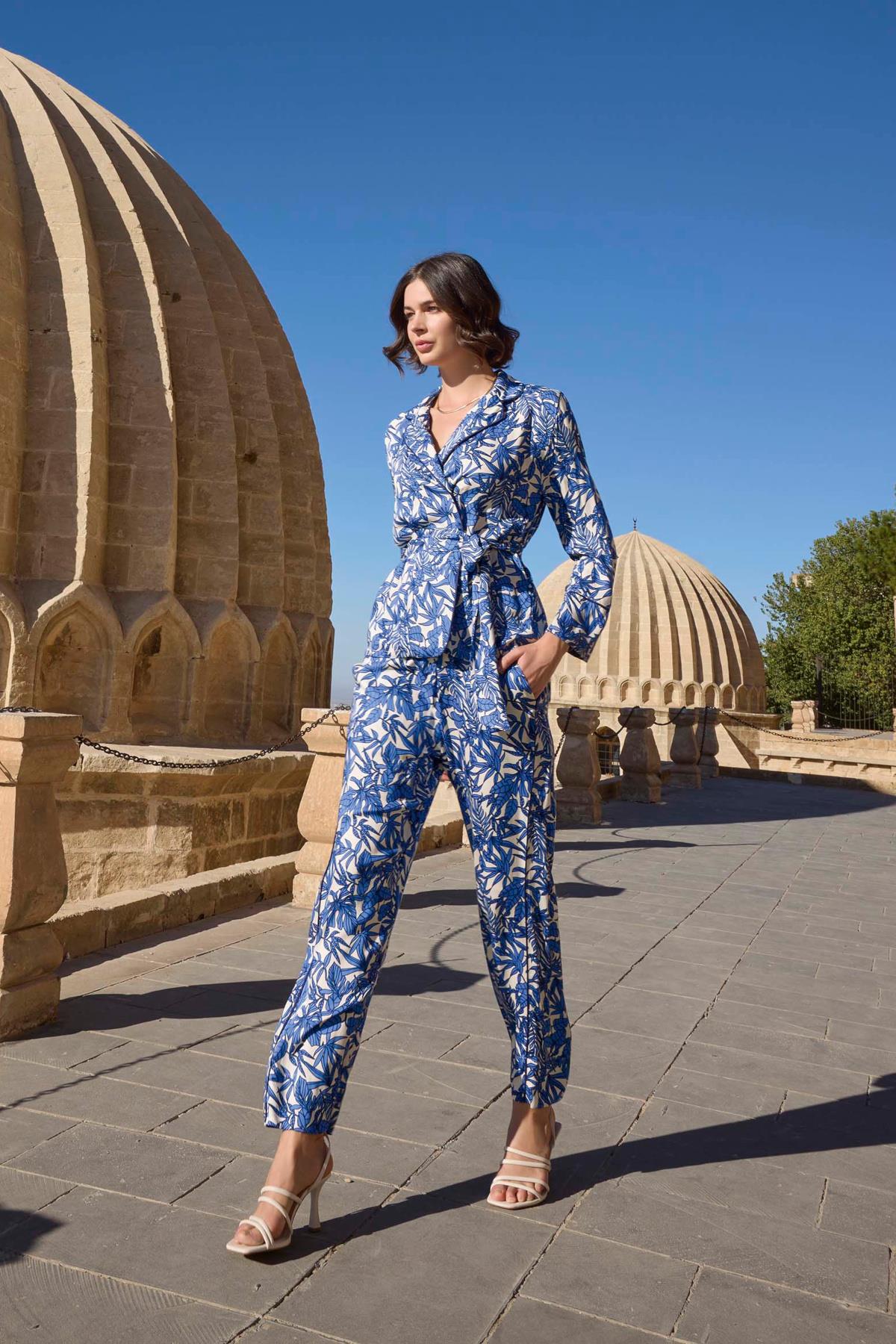 Üst: Beyaz zemin üzerine yaprak desenlidir, gömlek yakalıdır, uzun kolludur, kuşaklıdır, dokuma kumaştır. Alt: Beyaz zemin üzerine yaprak desenlidir, ceplidir, dokuma kumaştır.